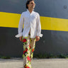 I could only envision this vintage Levi’s pant with these reclaimed red flowers, they’re perfect for each other. I then added some rhinestones for a little drama and decided to let the neon embroidery thread hang long as a homage to 70’s fringes.