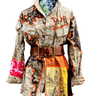 This gender neutral camo jacket has been elevated with brocade reclaimed floral cutouts, squares and rectangles depicting old cities and a pink lace patch. All the elements have been meticulously placed to create balance and are secured by hand-embroidering them with vibrant orange thread during 27 hours of labor. It can be worn loose or cinched at the waist.