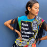 This vintage tie dye tshirt has been deconstructed in order to make an ode to female artists. It features raw hem, reclaimed fringe attached and repurposed black and white florals. All elements have been hand stitched with yellow embroidery thread during 18 hours of labor.