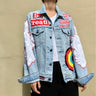 Vintage oversized denim jacket embellished with statements that remind us to be the best we can be. The rainbow is a sign of hope and the white embroidered appliqués are a sign of peace. The different colors of the embroidery thread bring all the elements together to create a 3-D effect. All materials pre-owned.