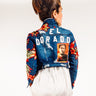 Red flowers and green leaves adorn the sleeves of this distressed cropped denim jacket. The back is appliquéd with "El Dorado" and Eric Clapton.