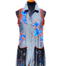 A very feminine and effortless silhouette: The Fraying Sleeveless Dress features floral cutouts, leather trim and armhole accents, all reclaimed from pre loved skirt, shirt and basketball jersey respectively while the neon orange hand stitching brings this amazing textile collage to life… The raw hem and finishes gives its unique character.