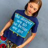 This t-shirt features a reclaimed inspirational graphic quote, sleeves that can be ruched with a removable red faux suede cord, slit sides, raw hem and a sexy opening in the back. All elements are hand-stitched with yellow embroidery thread. Size S