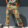 This GENDER NEUTRAL reused statement camouflage-print pant is accented with Keith Haring figures and red and white stripes carefully cut from a reclaimed t-shirt and jogging pant. All elements are hand-sewn with a neon yellow embroidery thread that pulls everything together into a burst of light. Completely one-of-a-kind, it can be worn loose, or cinched at the waist with a belt. Pair it with the Keith Camo Jacket for a really incredible look!