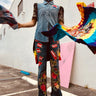 This pair of jeans is going to catch everyone’s eyes and minds when they are reminded to always laugh, it is cheap medicine!!!!! Embellished with beautiful dinamo red flowers, green leaves and sparks of teal, and Lord Byron’s quote, this pair is an absolute standout. The high side slits and raw edges gives them a cool edge and the very light moss green embroidery, a delicious freshness.