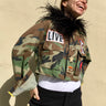 One-of-a-kind vintage camo statement jacket cropped for a more playful feel. Embellished with Swarovski crystals and patchwork made of phrases meant to exalt the virtues of living united to create a better world. Trimmed with feathers and adornments, and embroidered with contrasting colors that bring all details together to form a 3D effect.