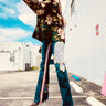 This pair of jeans are pure magic. Appliquéd with intricate white embroidered pieces, sports stripes and the word “magic” at the bottom of the back, it is finished with a dark lemon thread to bring everything together into a harmonious look. With its raw edges and boot-cut, wear them with a medium pointy toe pair of contrasting ankle boots.