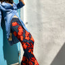 A garden of orange flowers cut from a dress decorate front and back of this flattering bootcut jean, hand-embroidered in place with a garnet satin thread that allows for a beautiful and harmonious effect. Frayed hems.