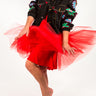 This black denim jacket is full of surprises. There’s the upside down Kikkoman label on the back, the tan leather fringes on the shoulders, and the sleeves full of green and blue flowers. All of those pieces and other parts of the jacket are hand embroidered with a beautiful tone of red which creates a rich contrast on the black denim. Frayed edges.