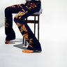Flowers cut from a vintage skirt decorate this flattering bootcut jean. It is hand embroidered with red satin thread for a subtle contrast and a 3D effect. Keeping it long allows for a great streamlining effect.