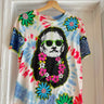 I do love tie dye and when I spotted that Bill Murray tee I knew they had to go together. I added some daisies reclaimed from a shirt and some blue garden motifs cut from a blouse. In the back I placed one of my signature graphic quotes. The bold green embroidery thread brings all the elements together to create a true statement piece. The raw finishes add character to this piece.