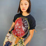 This previously owned gender neutral t-shirt features a reclaimed zodiac sign and sleeves that can be ruched with a removable faux suede cord. All elements are hand-stitched with bright yellow embroidery thread. Size M/L Gender Neutral