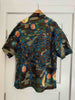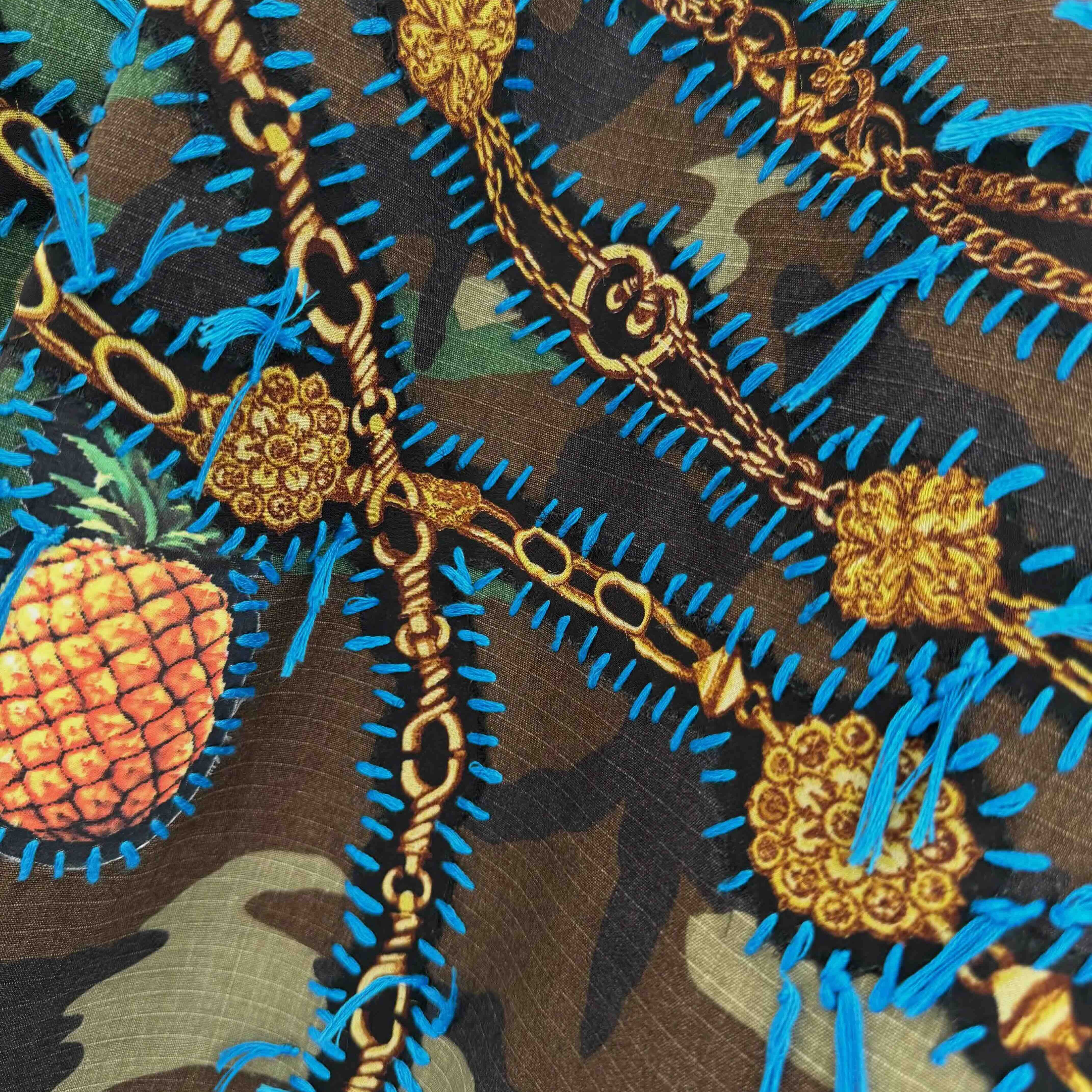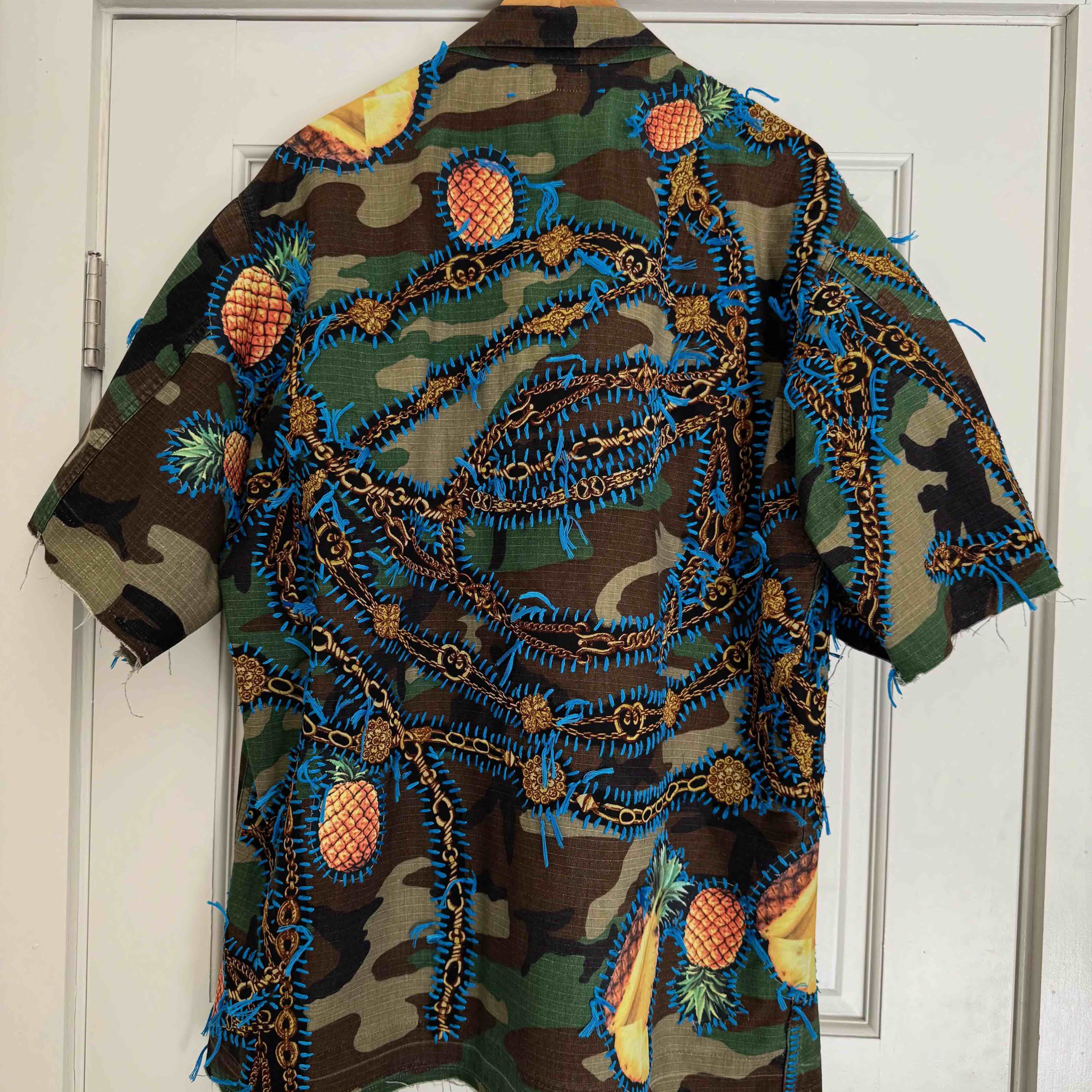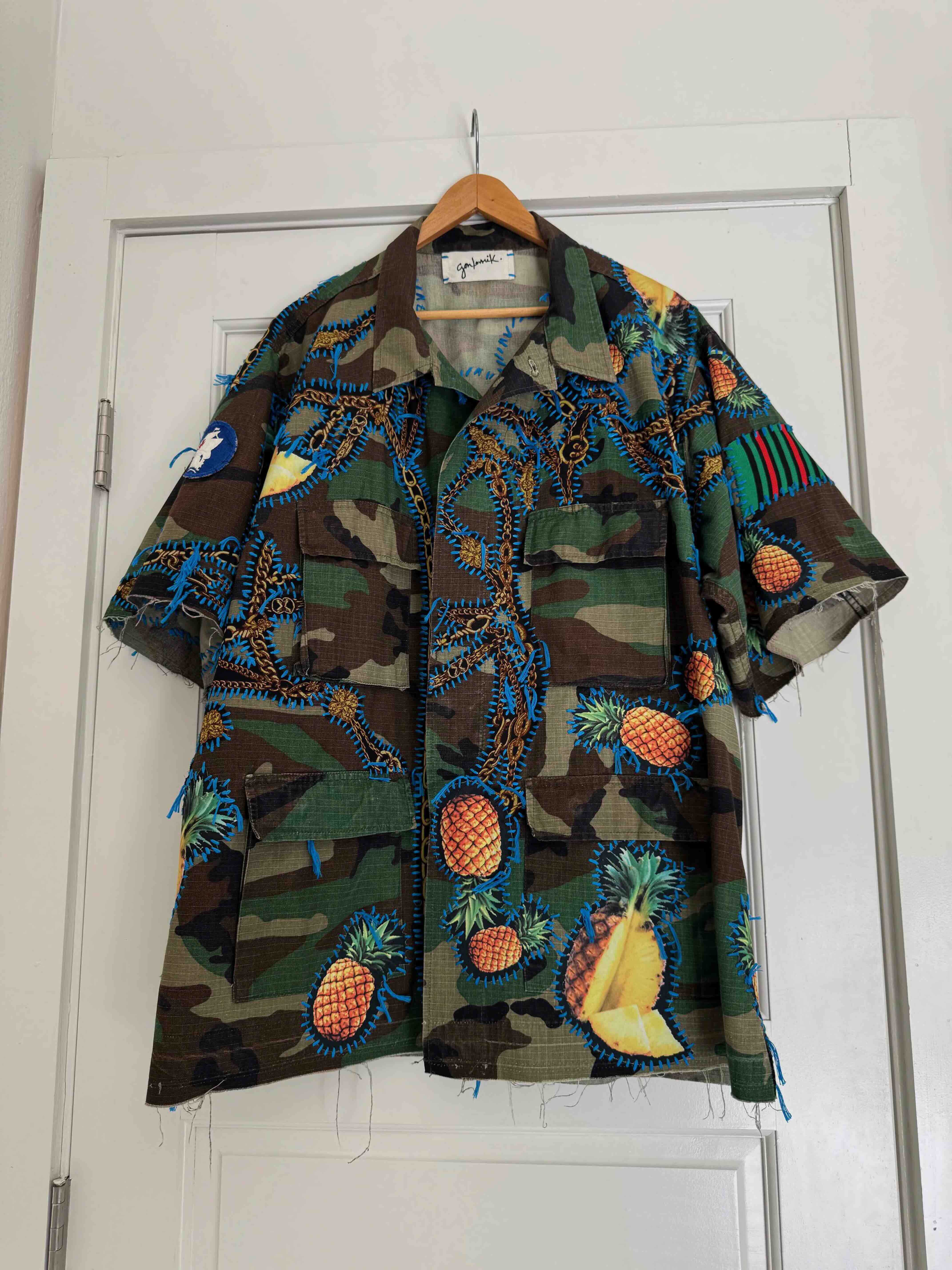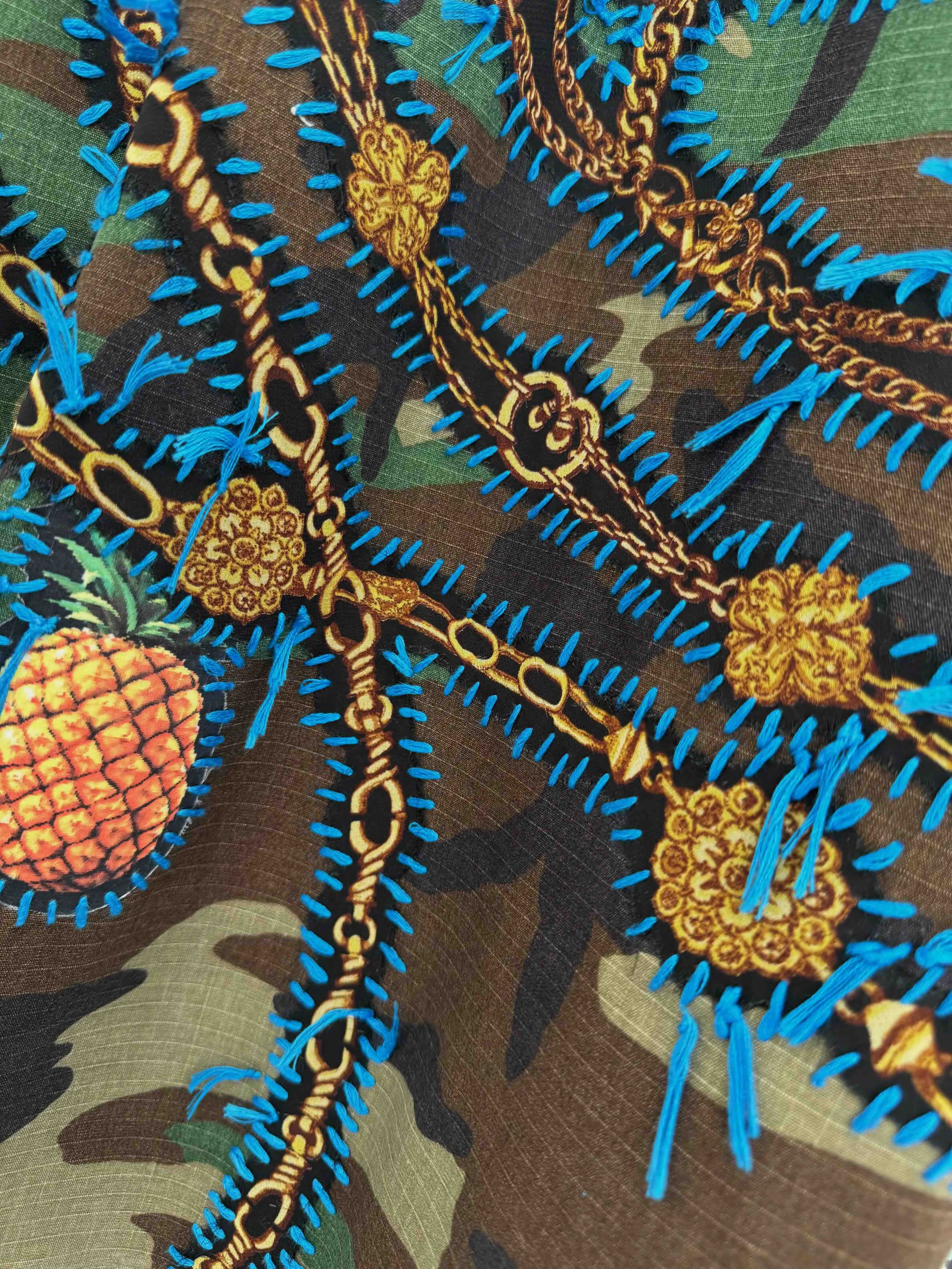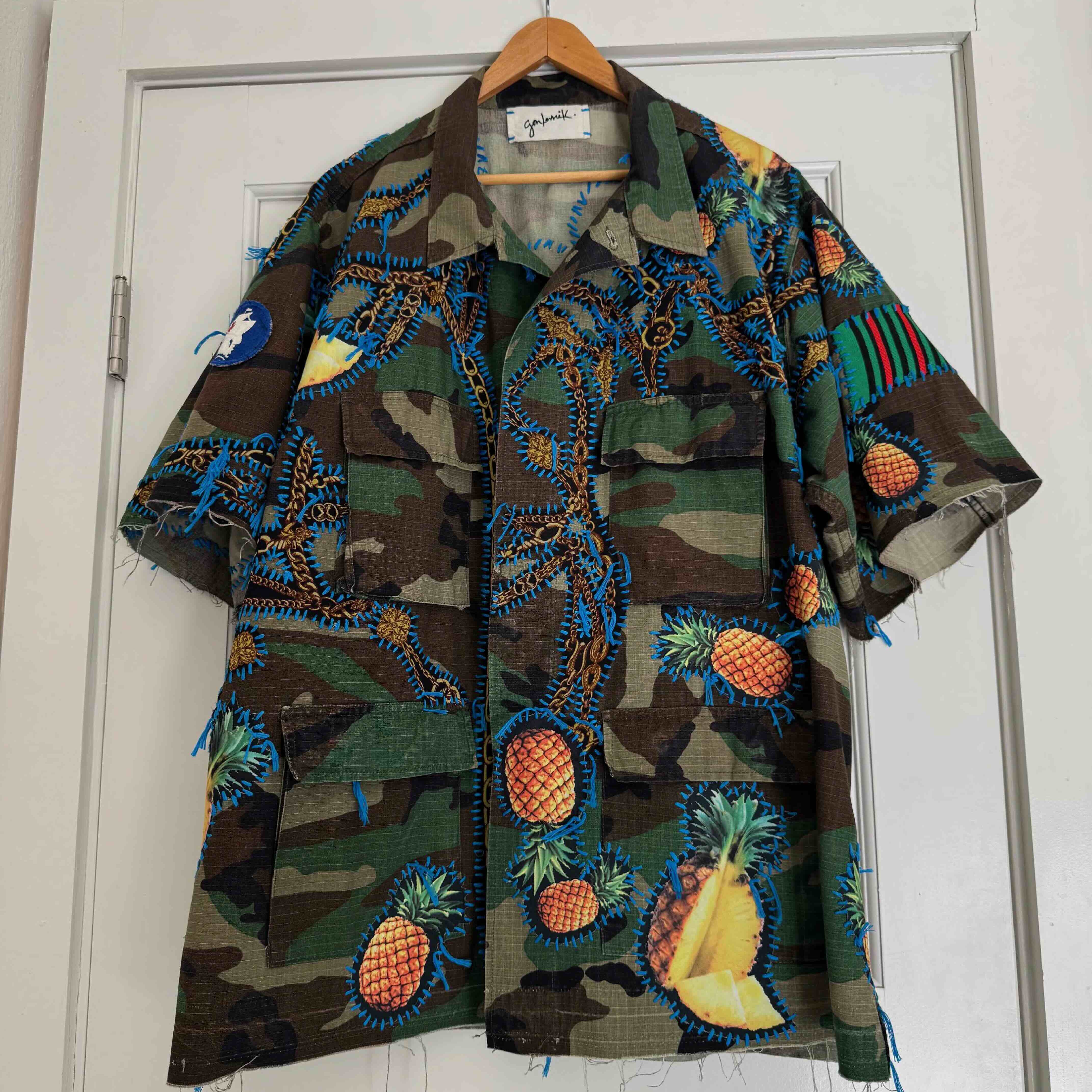 I love working on military pieces contrasting them with softening motifs. This one I collaged with beautiful yellow pineapples reclaimed from a surf short and a chain print from a blouse. It is meant to be oversized. You can wear it loose, as an overshirt, roll up the sleeves, or belt it