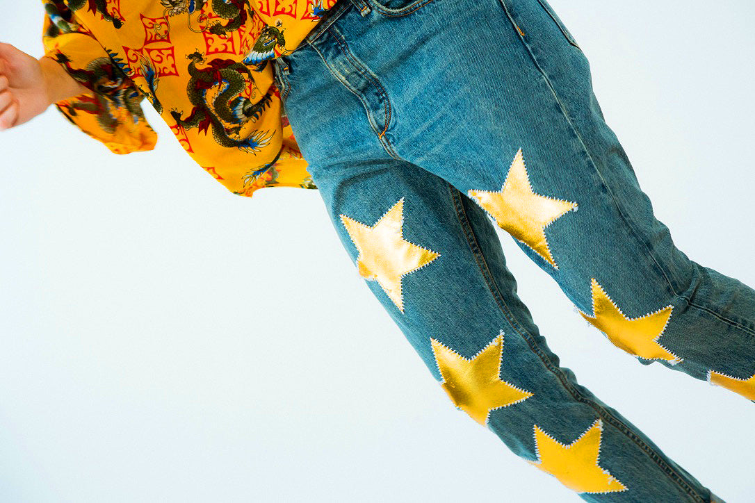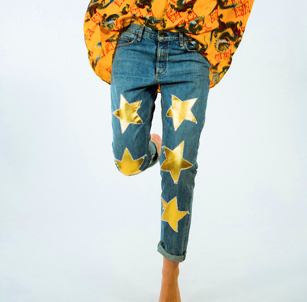 These jeans are appliquéd with rich gold leather stars and embroidered with white thread - together, as symbol of a peaceful future. This boyfriend pair is designed to be worn loose and low on the hips, and turned up at the cuffs.