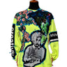 I designed this unisex sweatshirt by collaging reclaimed materials like flowers cut from a dress, the Einstein and aspirational words from t-shirts. I love placing those side zippers that you can play with on all my sweatshirts, makes them a lot of fun. The blue embroidery thread brings all of the elements together.
