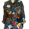 I had just returned from a great vacation, I was feeling free and colourful and this pre-owned jacket and the pants are the result of that! I mixed reclaimed toucans cut from a dress and deep green jungle foliage cut from a skirt, and then added some white flowers cut from a pant to keep the look crip and fresh. The stripes add balance and the bright turquoise embroidery thread adds to the beauty of the piece.