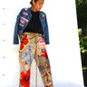 I designed this gender neutral camo pant by mixing and collaging oversized red flowers cut from a dress, a cheetah cut from a t-shirt, safari inspired wild animal images cut from a skirt, embroidered leaves and truck cut from t-shirts. Each piece on this pant is hand-embroidered in neon green and blue that pulls everything together to give it light.