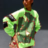 This GENDER NEUTRAL statement piece is accented with embroidered mesh in black/silver carefully cut from a reclaimed shirt. The graphic motif reads “Truth” and includes the New York skyline, carefully cut from a reclaimed t-shirt. Each side of this sweatshirt features a zipper to be opened or closed for the desired look. All pieces are hand-sewn with a deep red knitting thread to pull everything together into a burst of light.