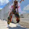 I love mixing and matching motives and that is exactly what I did with this reclaimed camo pant and flowers cut from a dress and a blouse, African motives from a top, stripes from a pant, cat from a curtain and graphics from t-shirts. All hand-embroidered with neon yellow embroidery thread for a great pop!