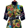 I found this t-shirt with the theatre/ballet theme on a street vintage sale and thought the colors and the naivete of it all would look great on camouflage. I collaged those pieces with reclaimed flowers cut from a dress, and an earthy foliage cut from a top. To add balance to the whole look, I added the sleeves cut from a blouse, and of course the neon green embroidery thread to highlight the whole piece.