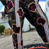 This camo pant’s purple roses are carefully hand-embroidered with a bright orange floss that creates a beautiful contrast. It has white sports stripes in the front and bright green ones in the back that make the pant really pop. All materials used to design this piece are repurposed.