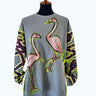 I designed this unisex sweatshirt with flamingos cut from a reclaimed shirt and chains from a dress. A zipper on each side allows you to freely play with the silhouette while the neon lemon embroidery thread makes everything explode!