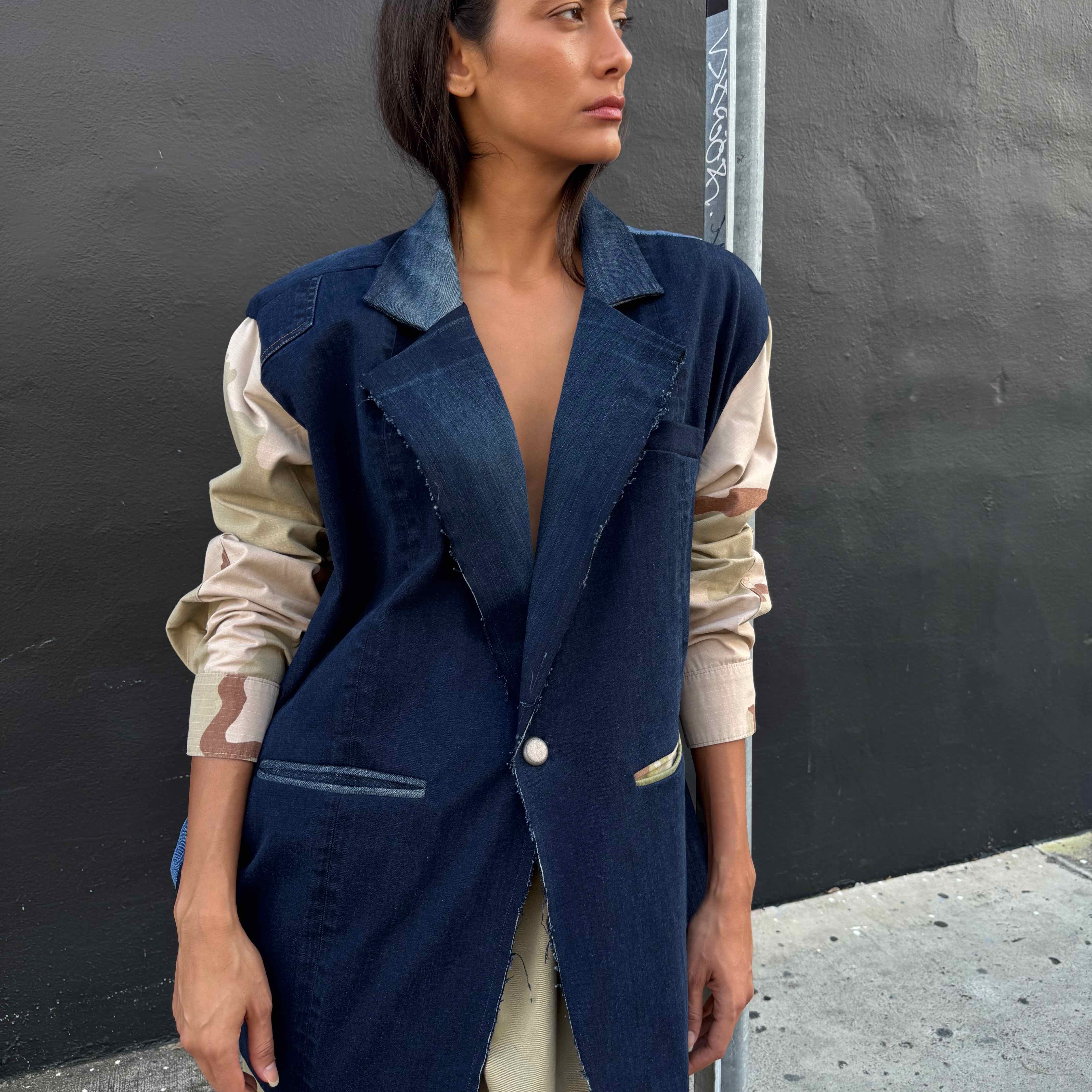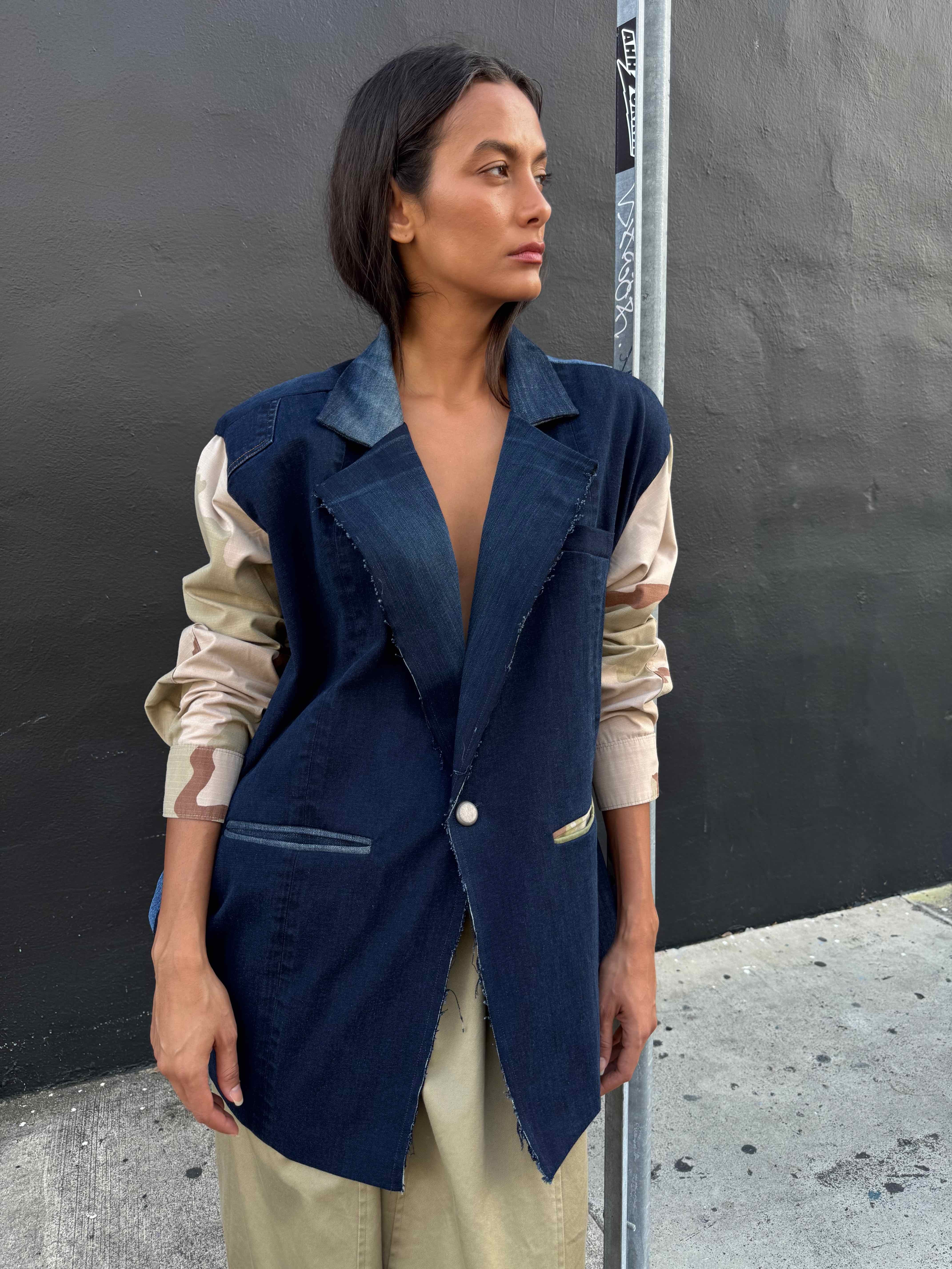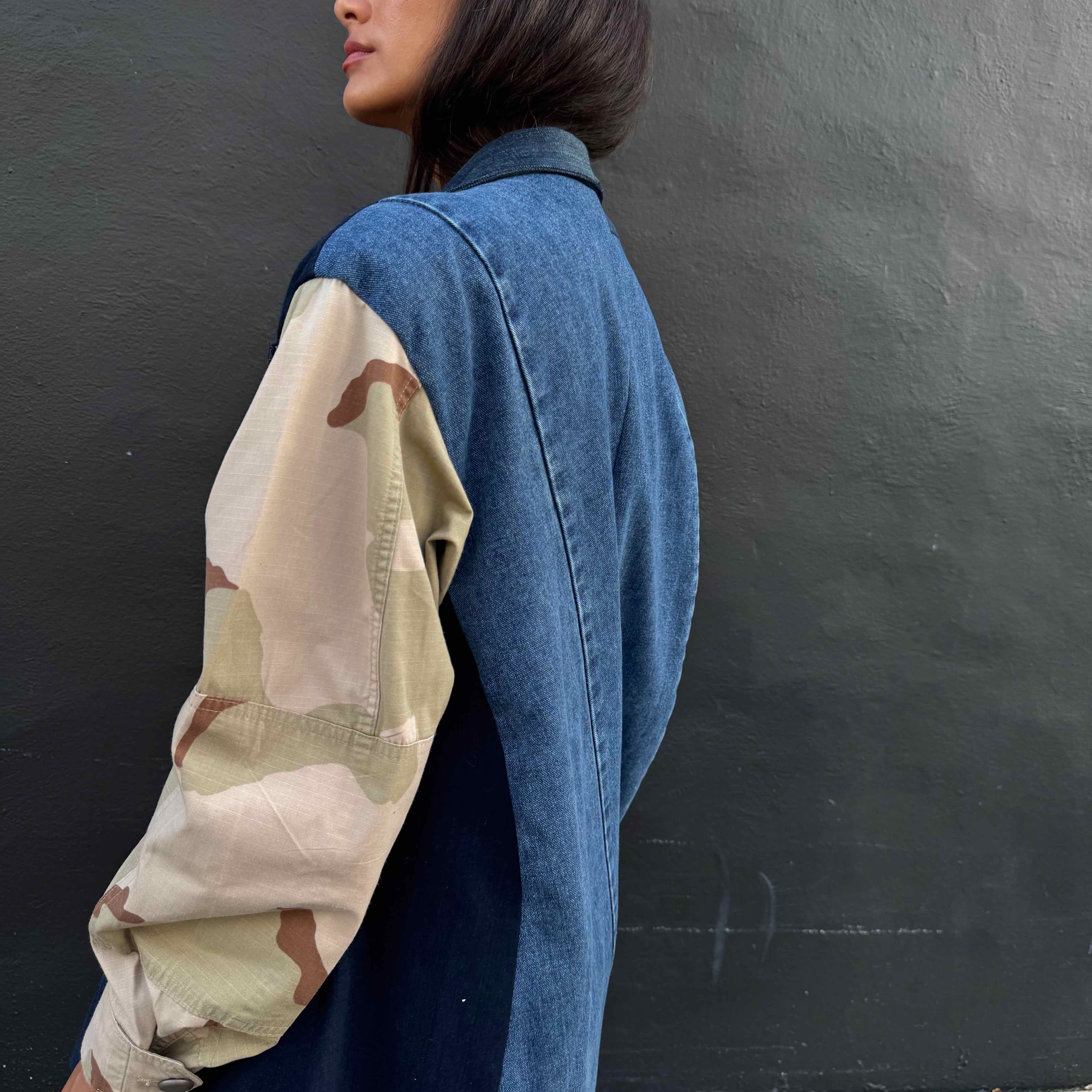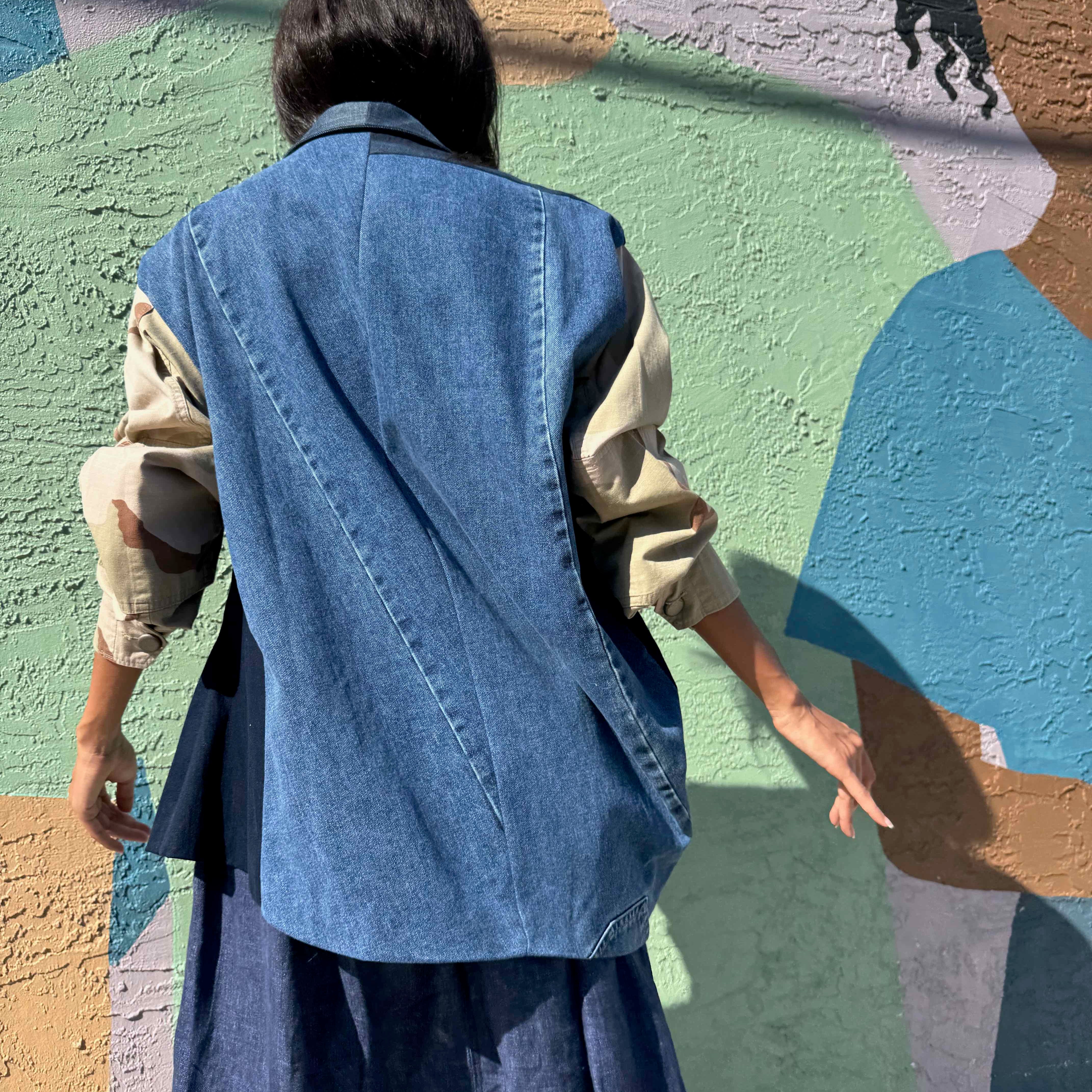 This jacket was crafted from at least 6 different pairs of jeans, allowing me to play their shades, textures and other details like pockets. The camo sleeves were cut from a jacket that I had converted into a vest.