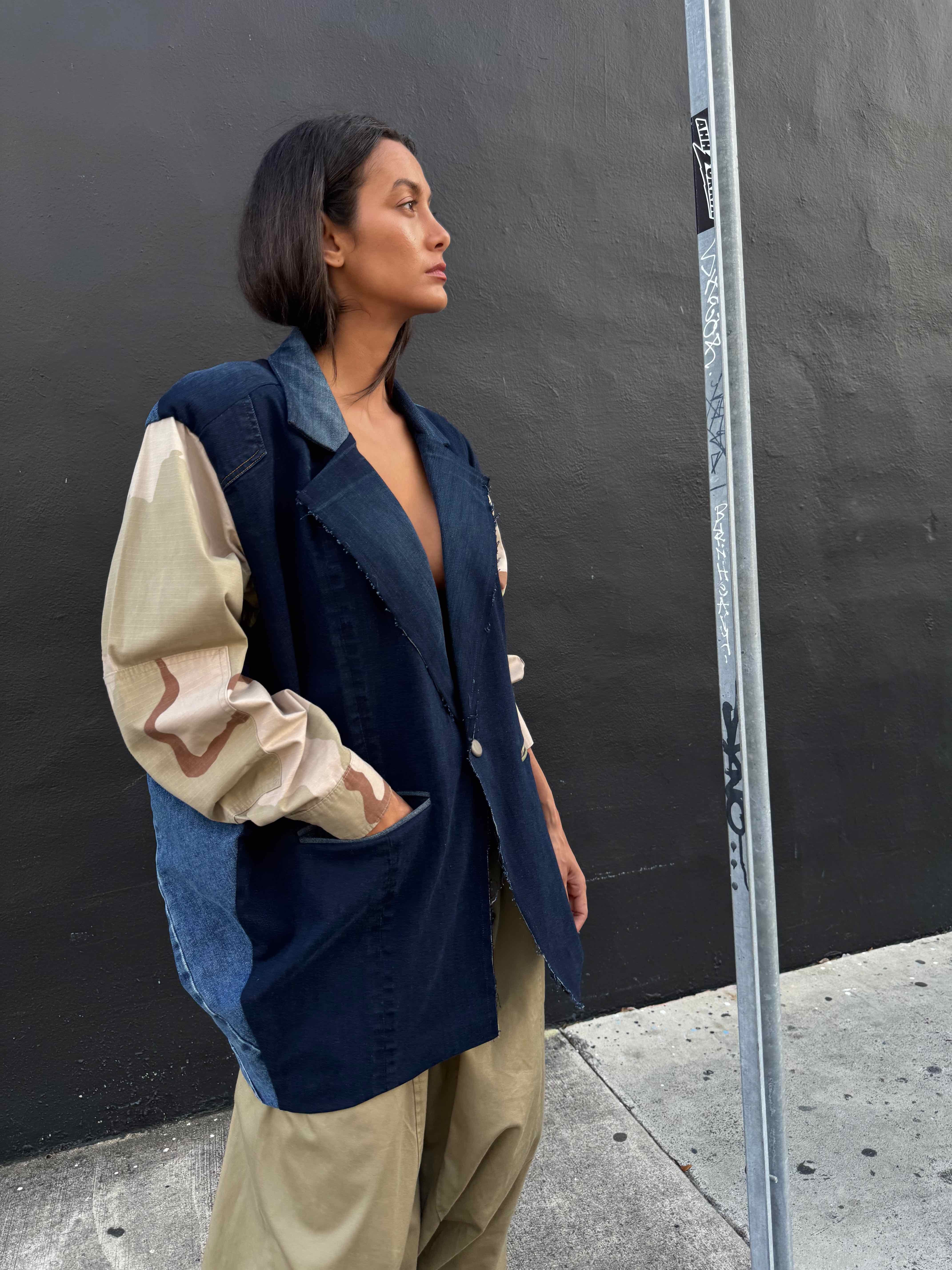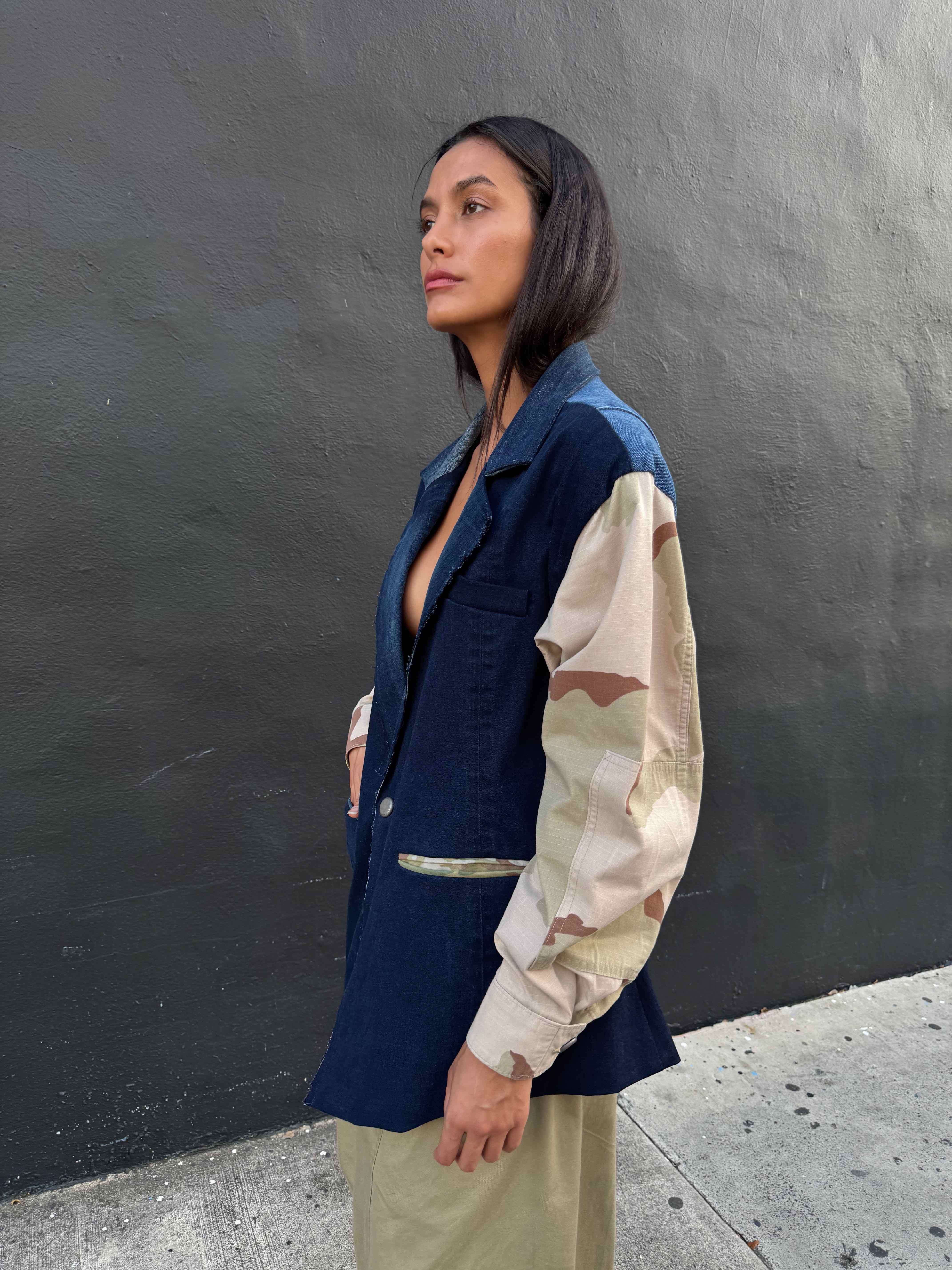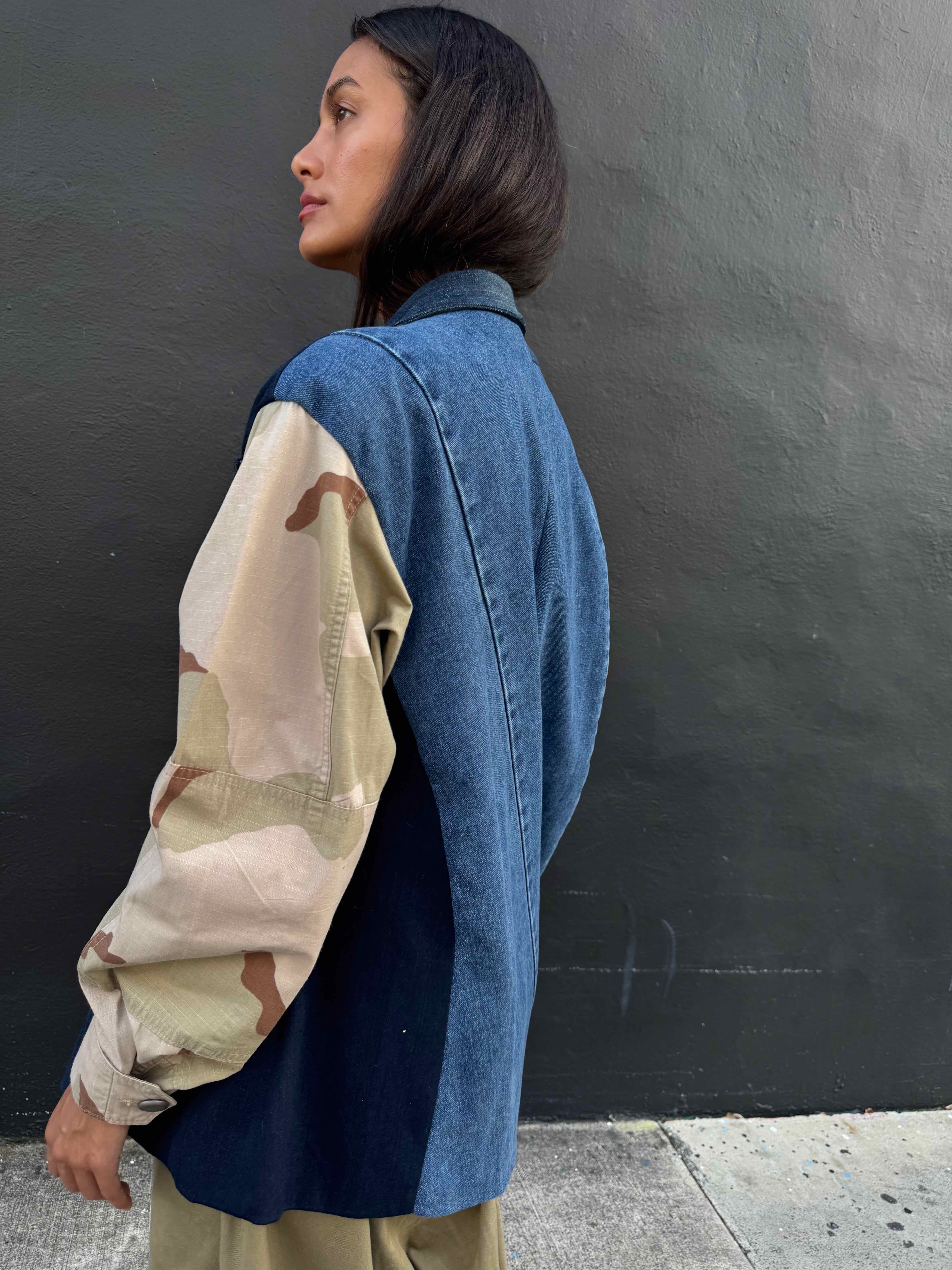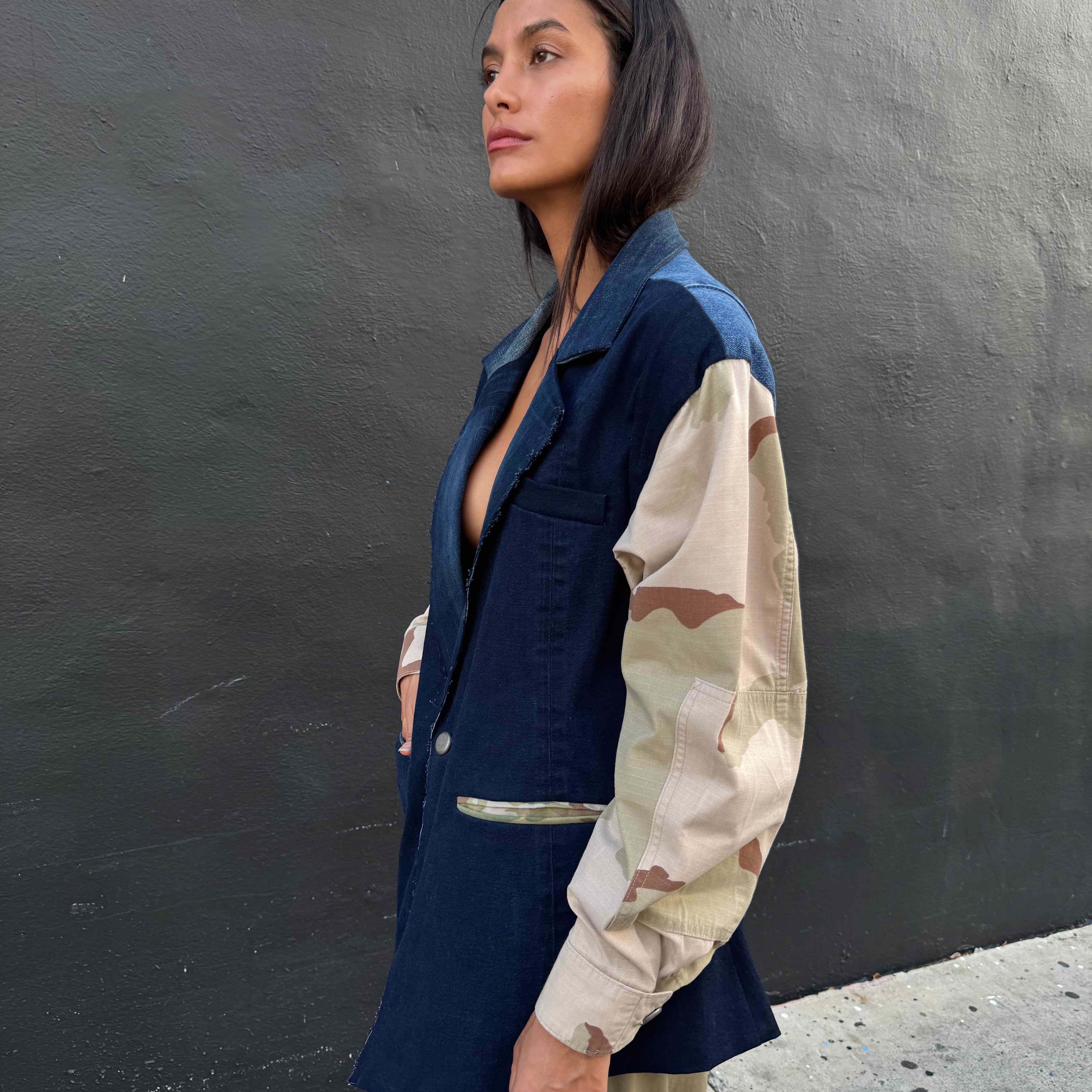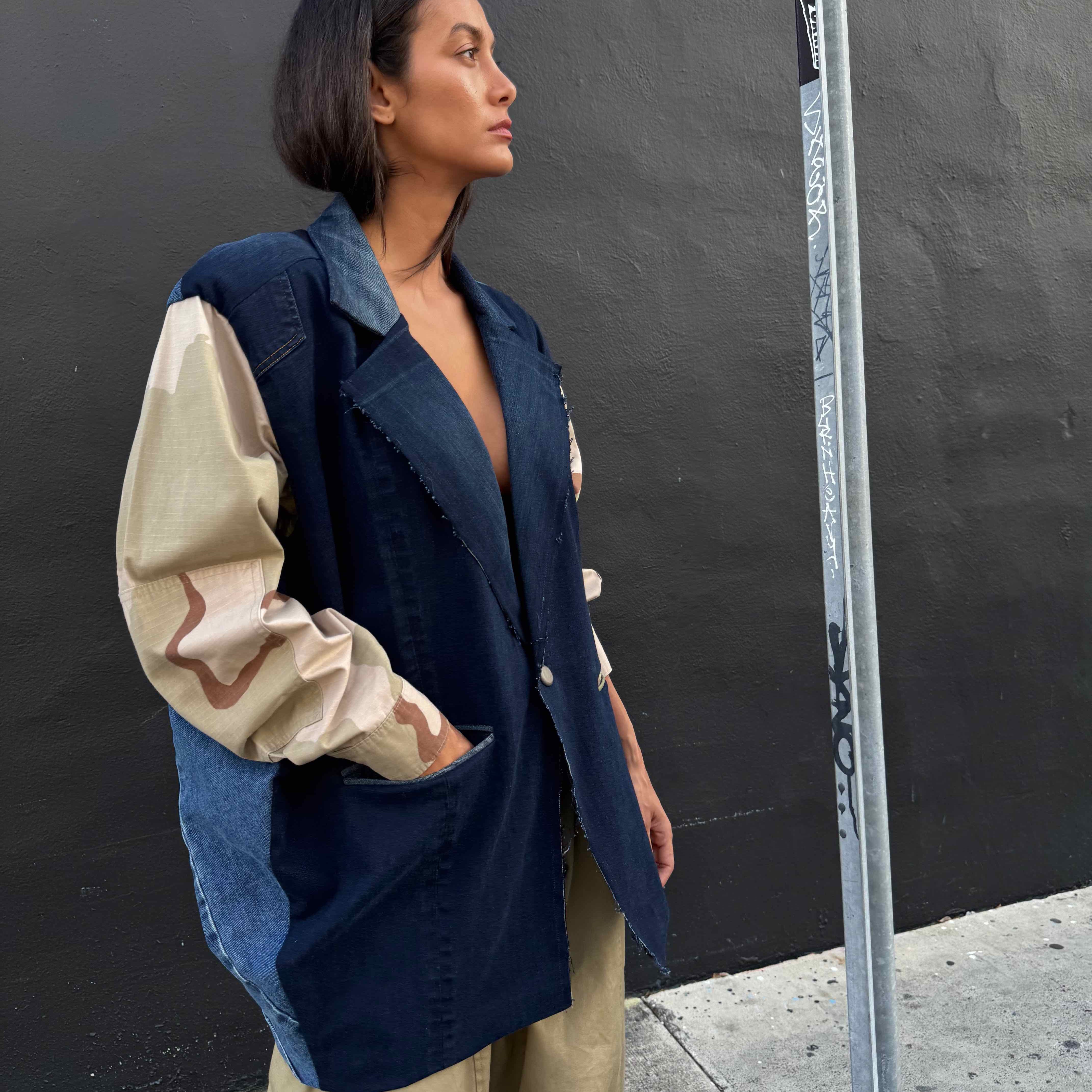 This jacket was crafted from at least 6 different pairs of jeans, allowing me to play their shades, textures and other details like pockets. The camo sleeves were cut from a jacket that I had converted into a vest.