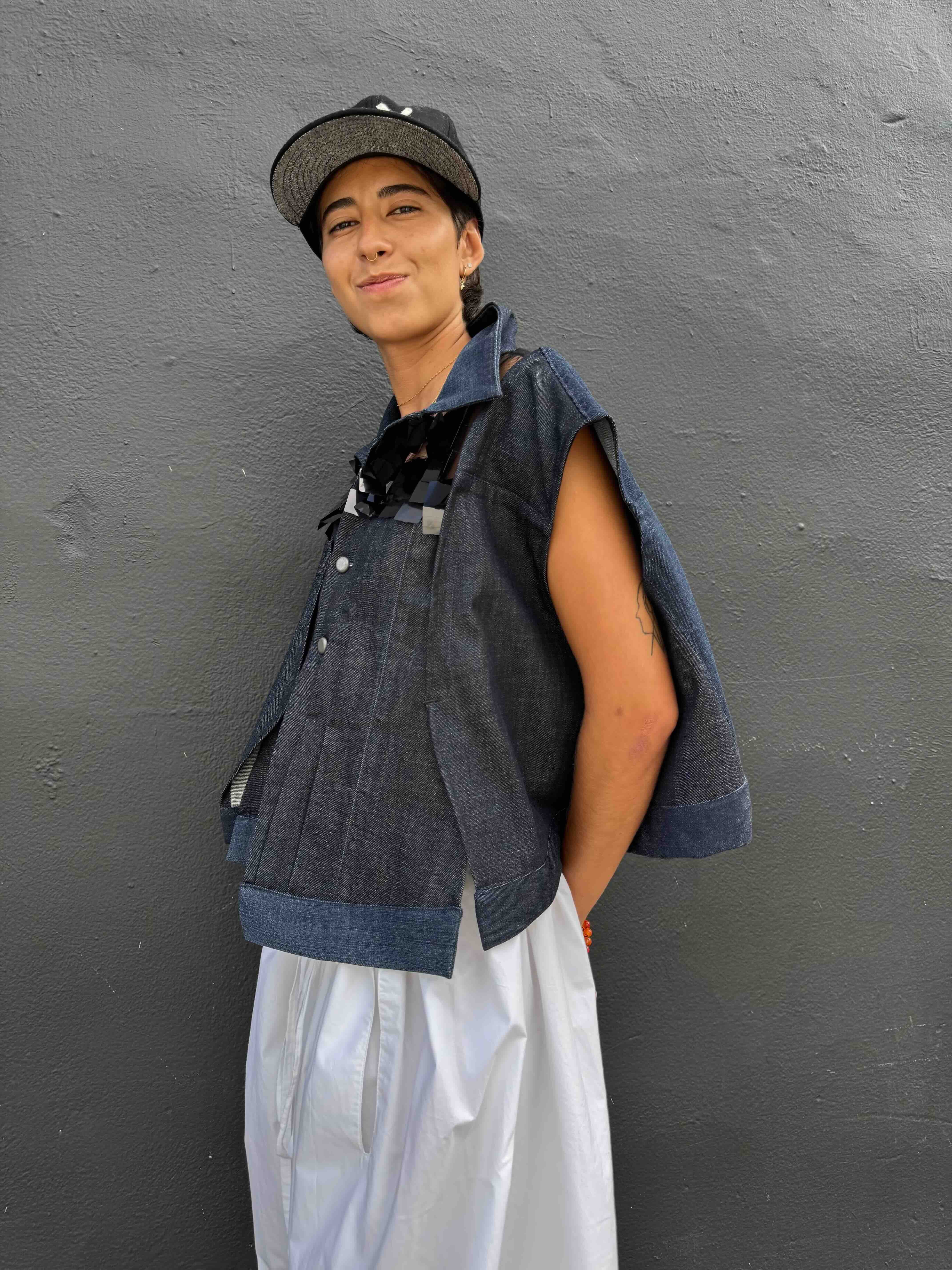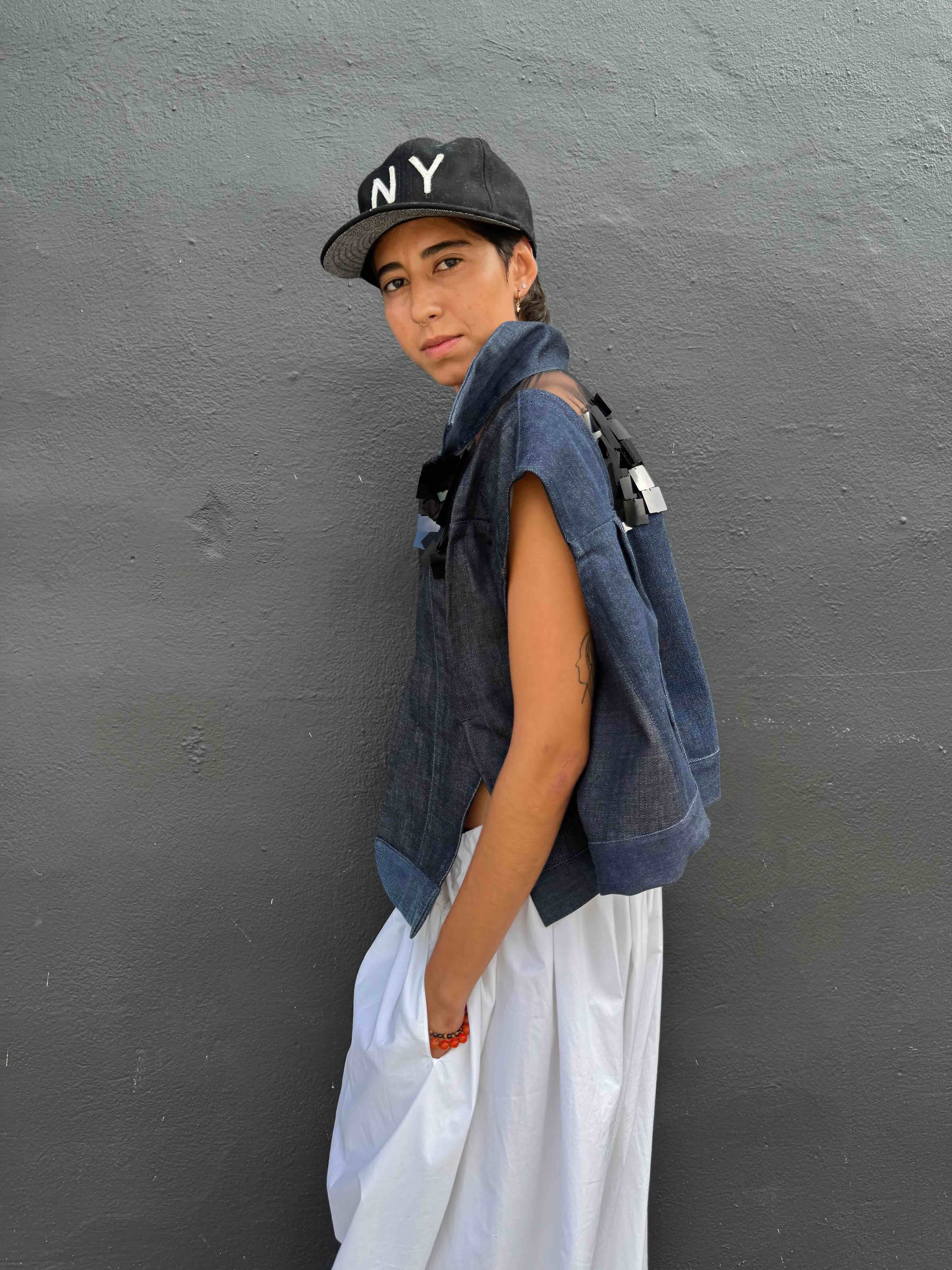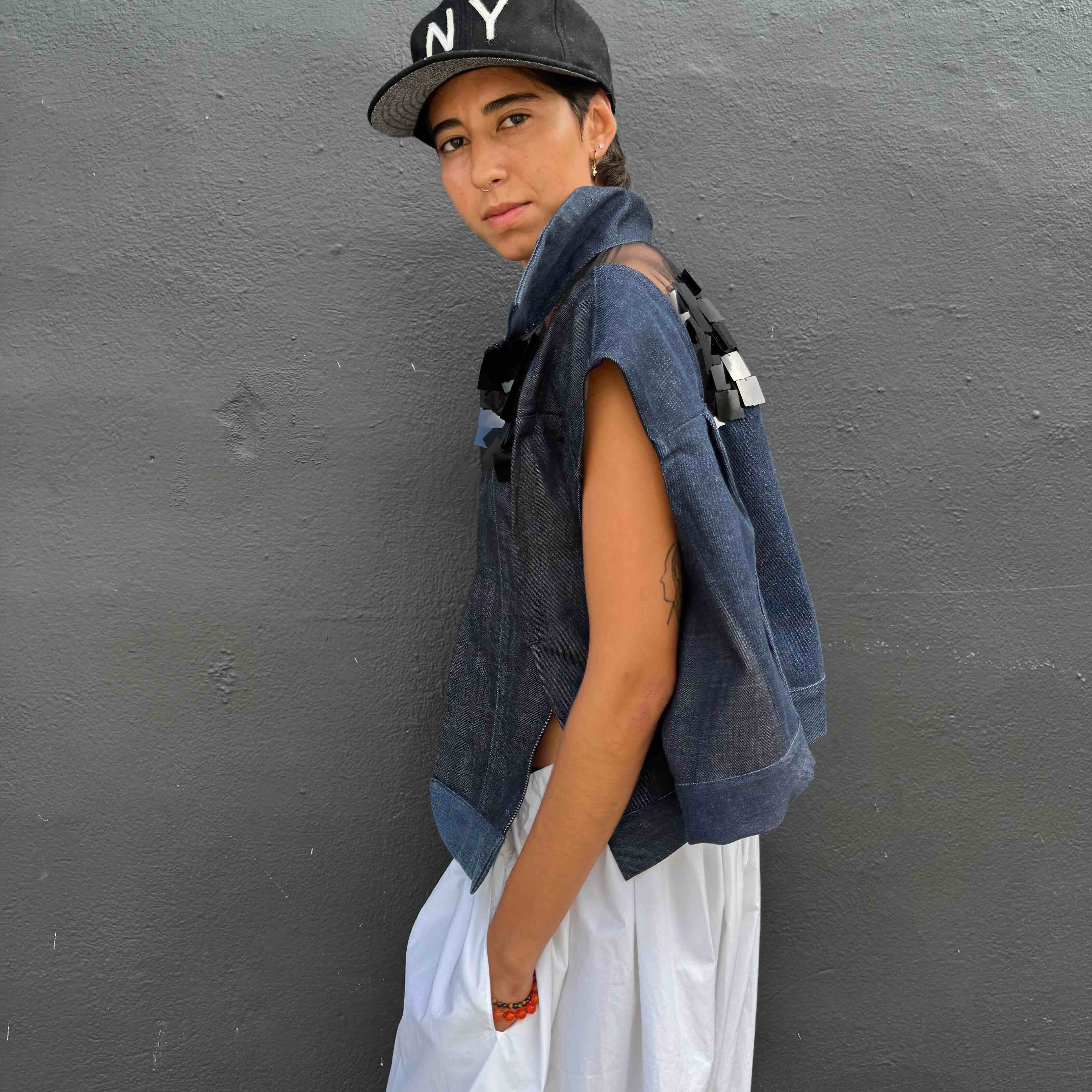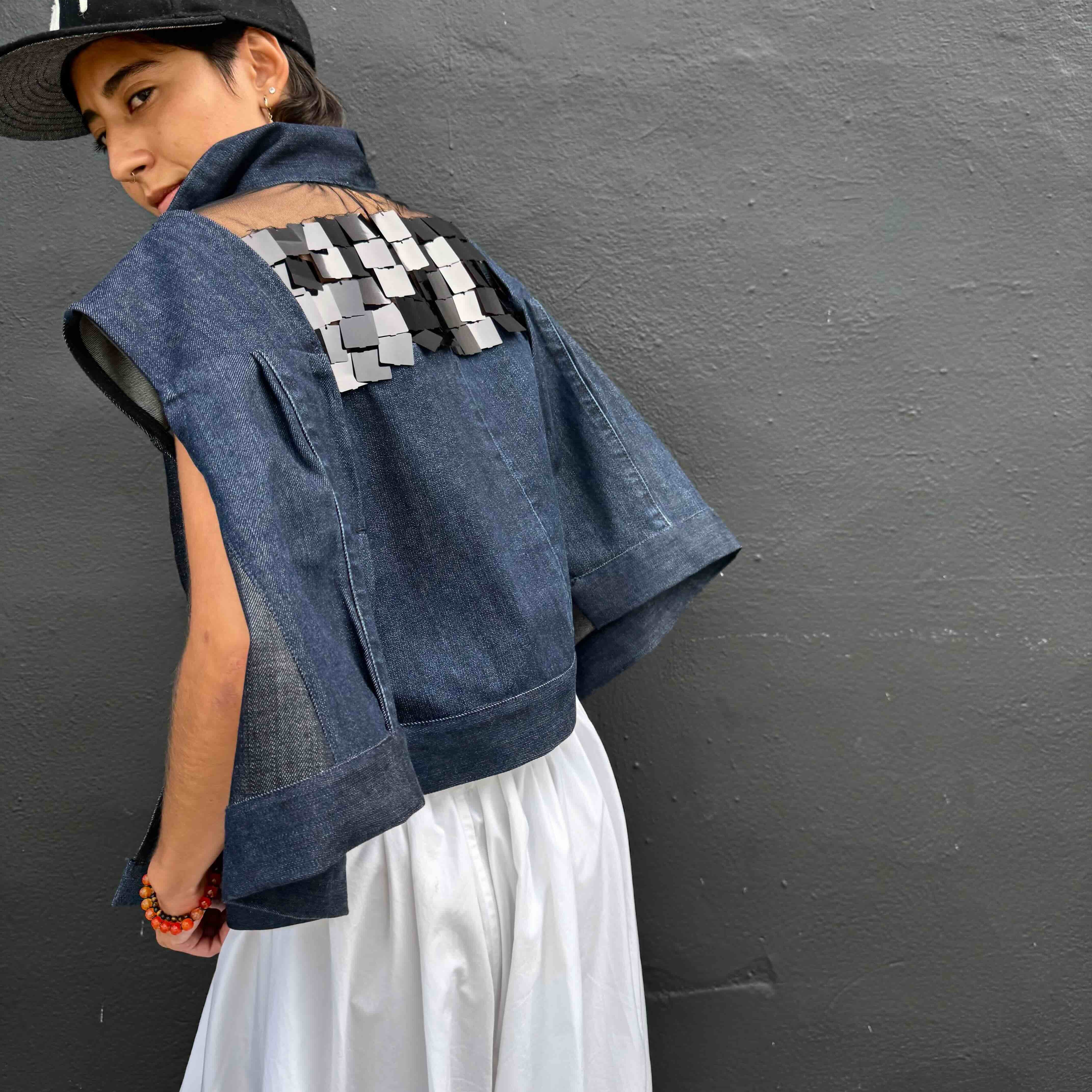 This jacket merges a deconstructed jean with paillettes layered over mesh, creating a textured interplay of structure, shimmer, and transparency