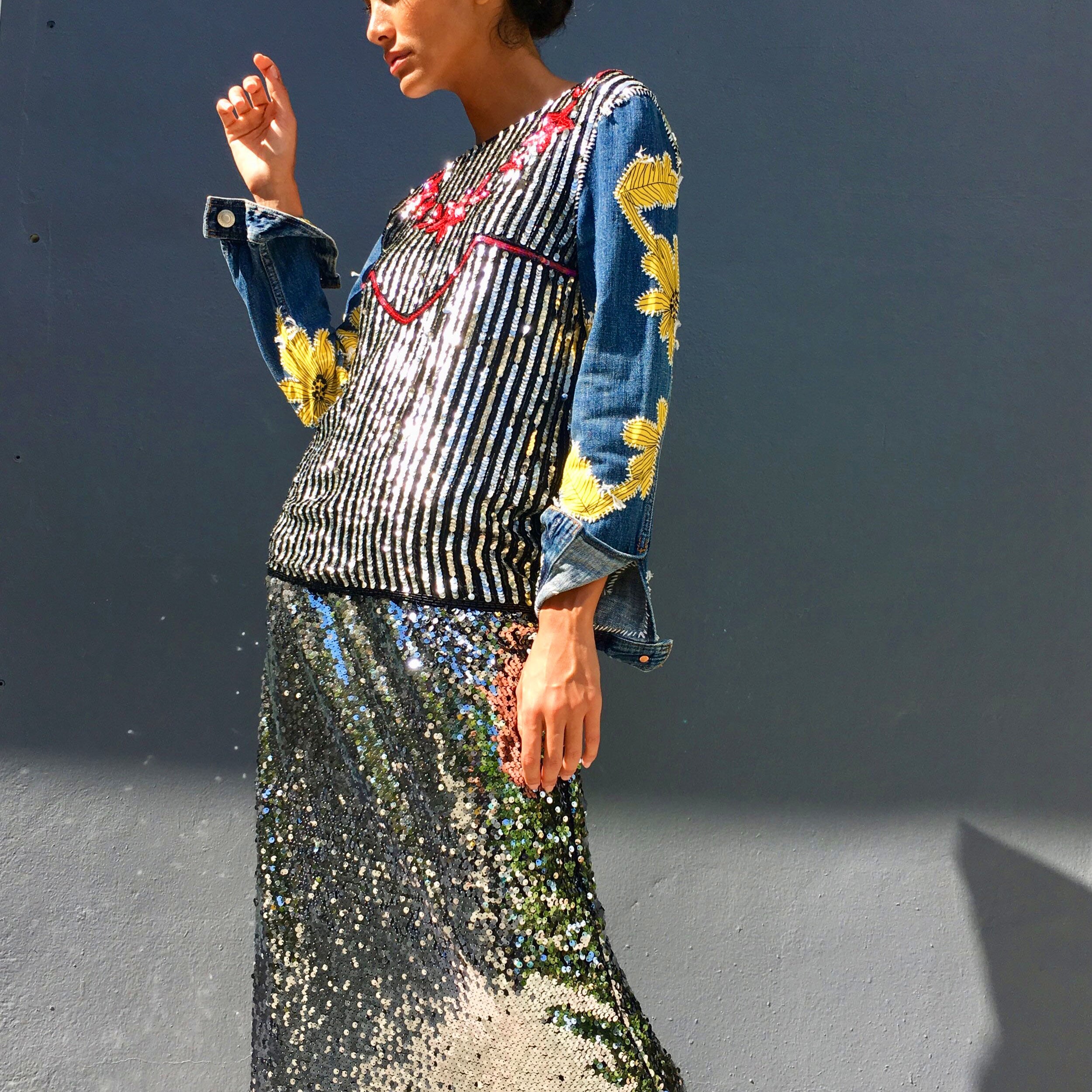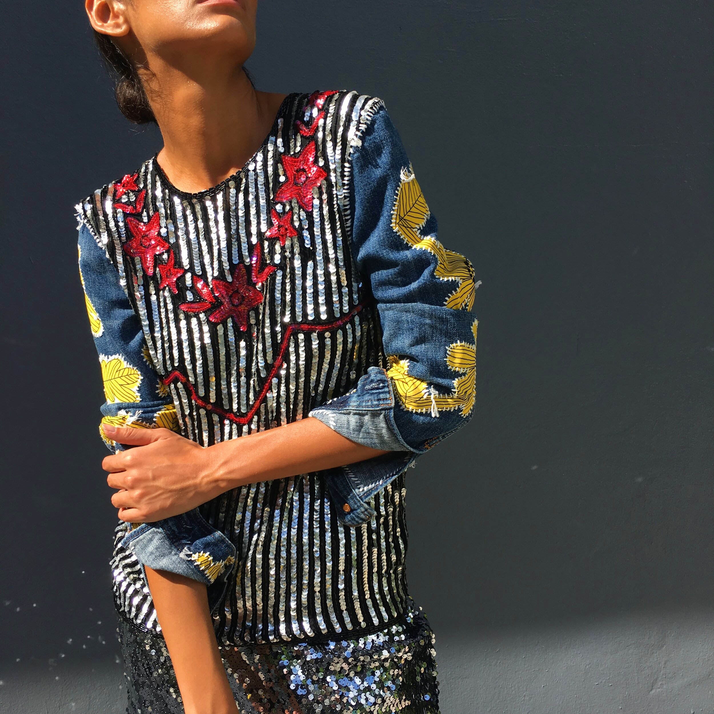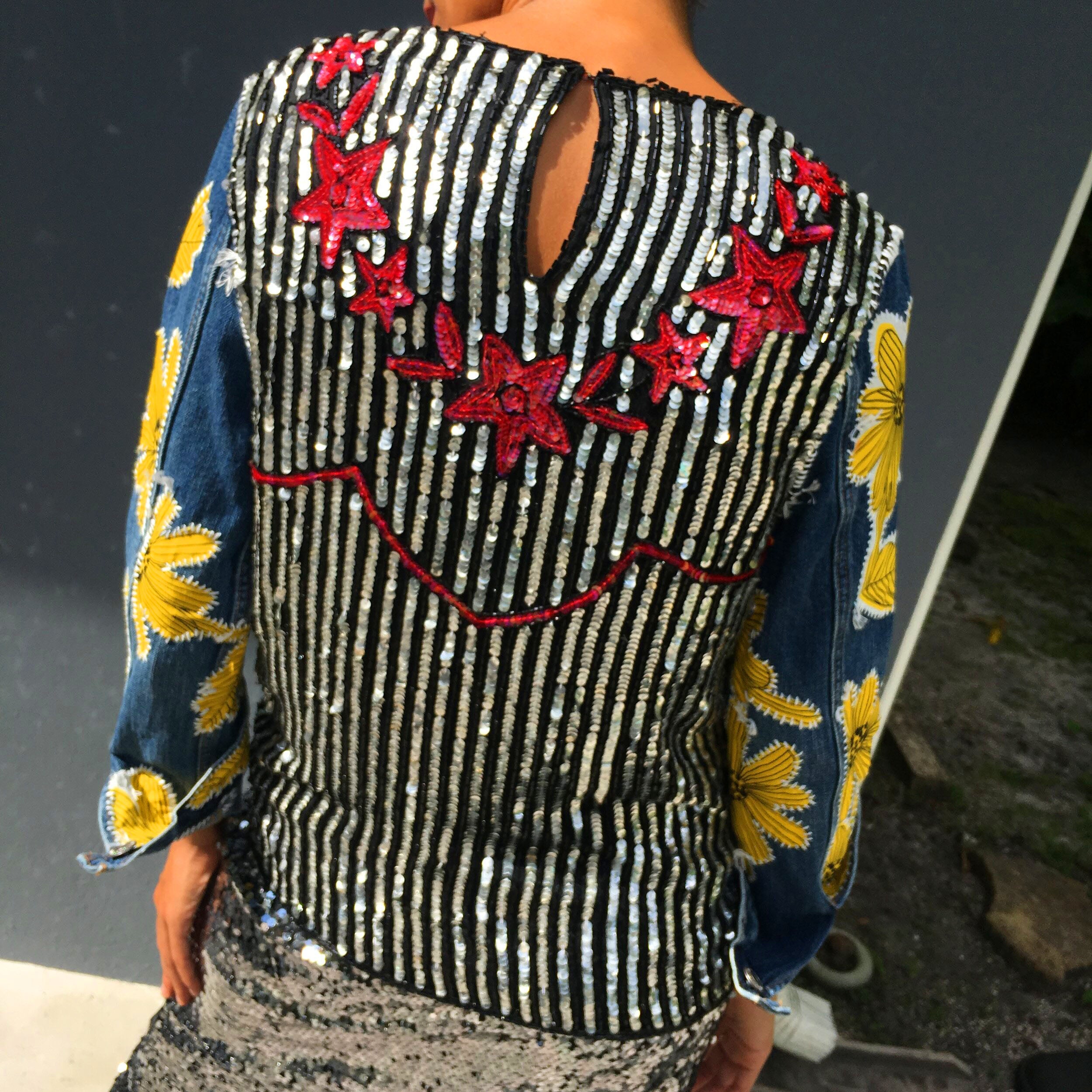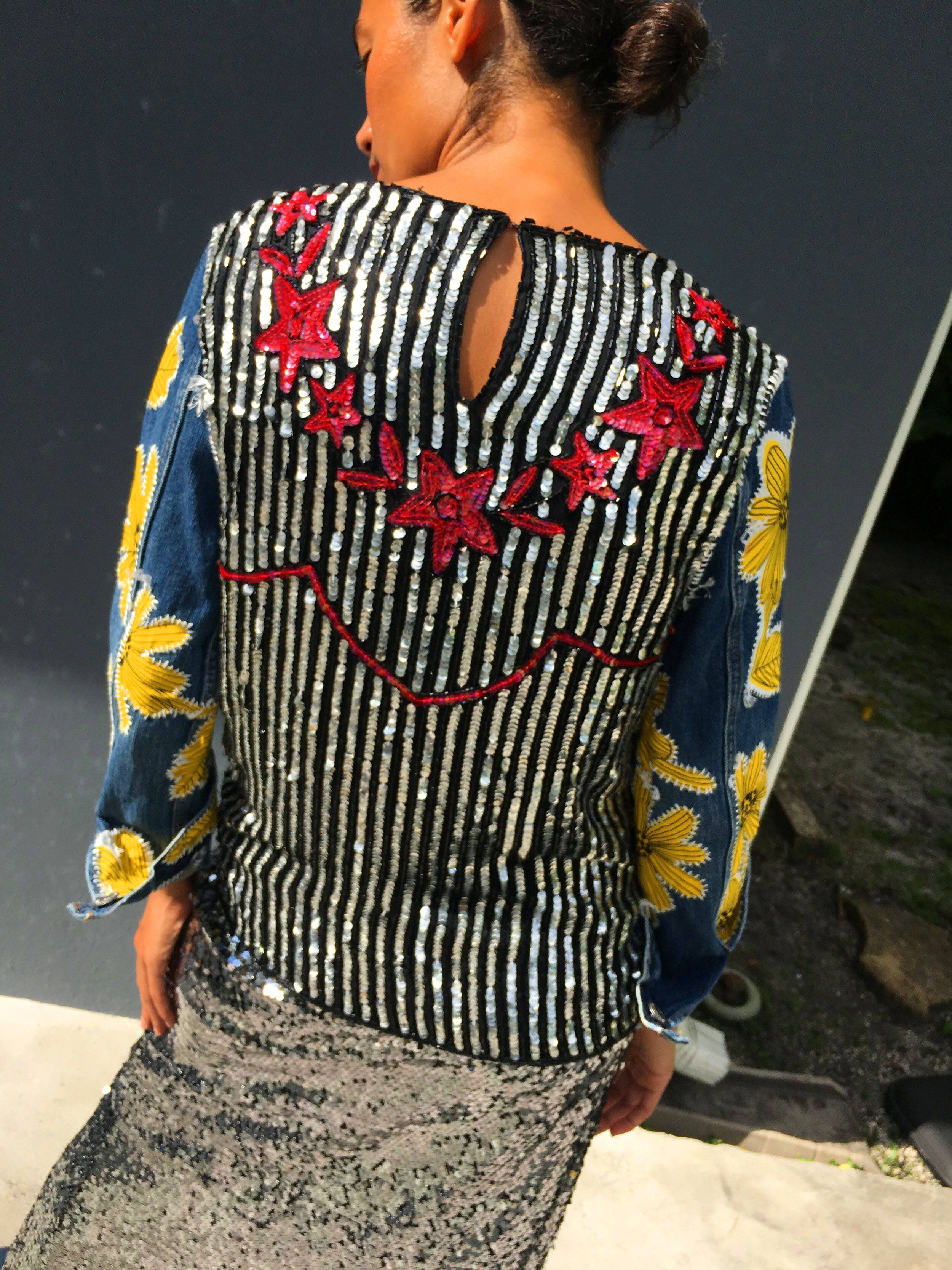 To design this beautiful vintage black silver and red sequin top I replaced the sleeves with repurposed denim ones cut from a jacket and placed yellow flowers cut from a playsuit. The white embroidery thread lets every element shine.