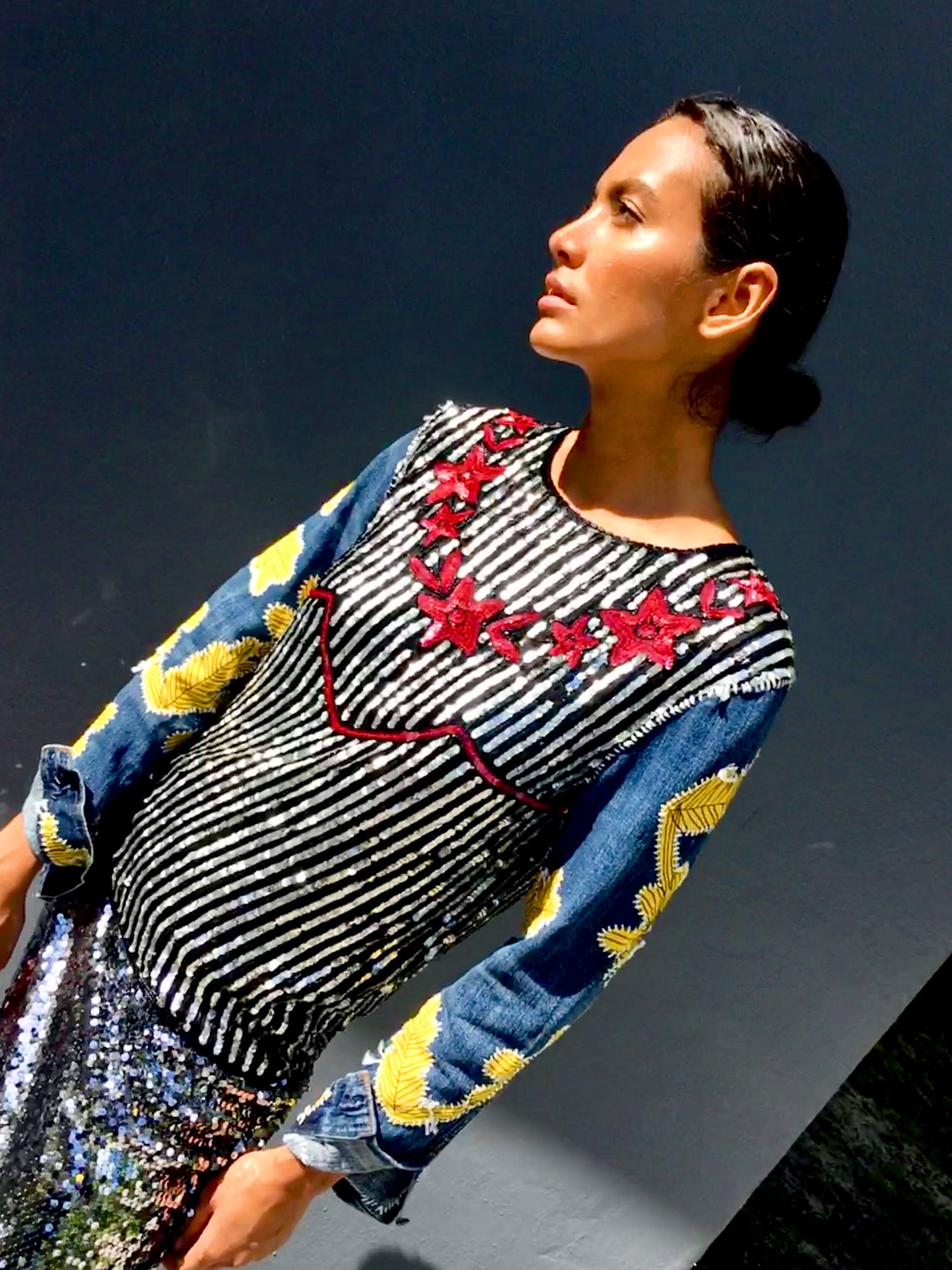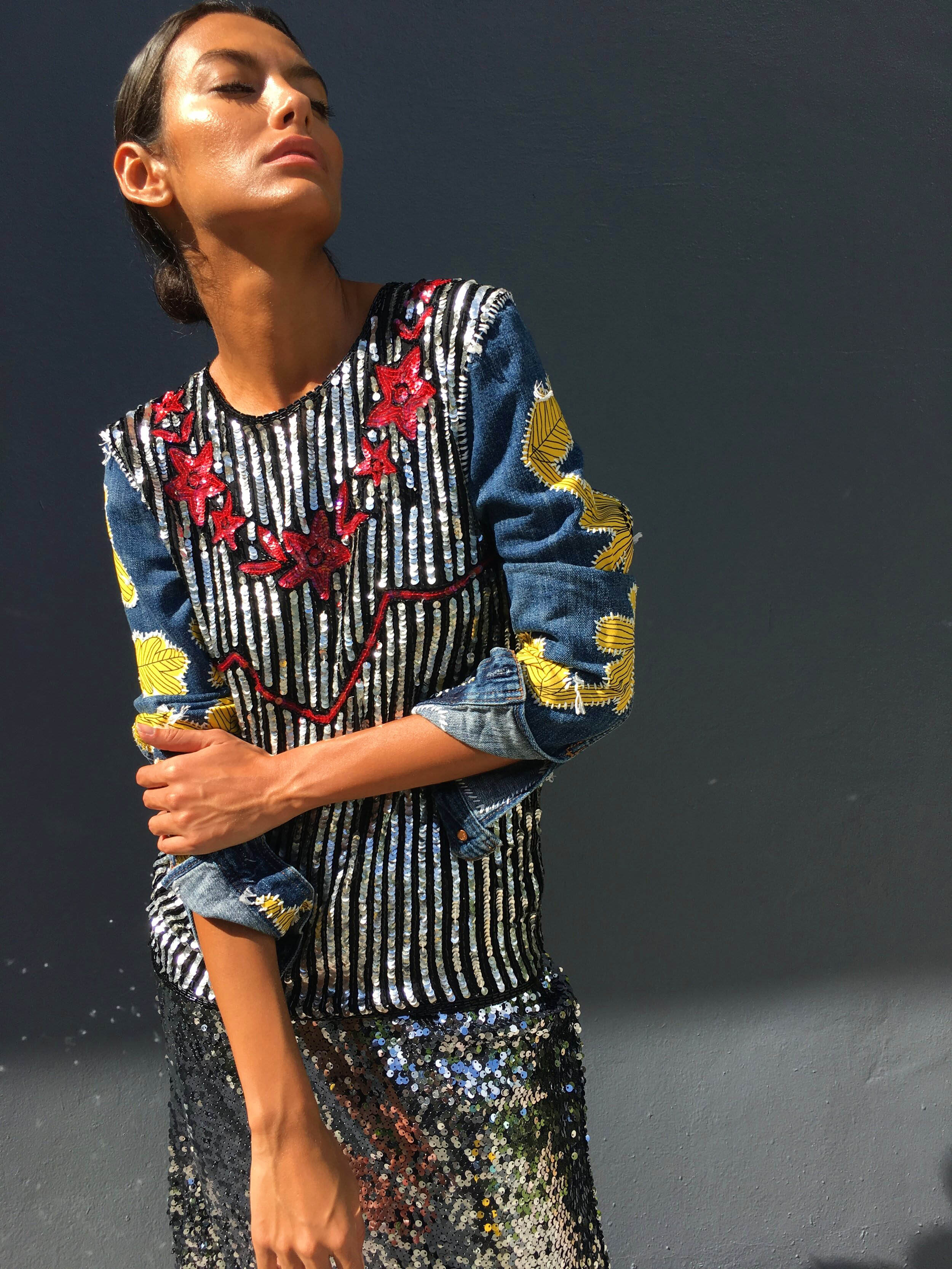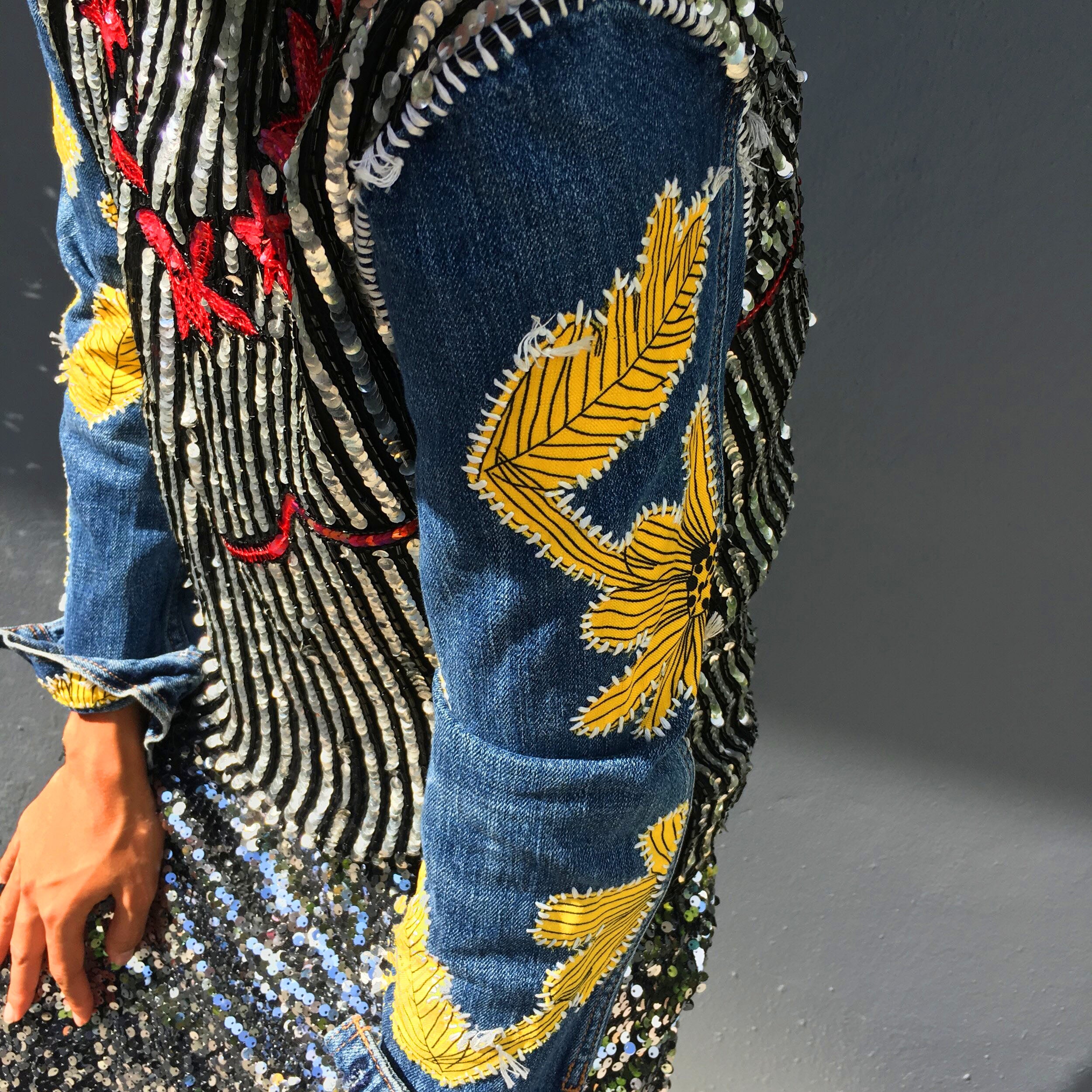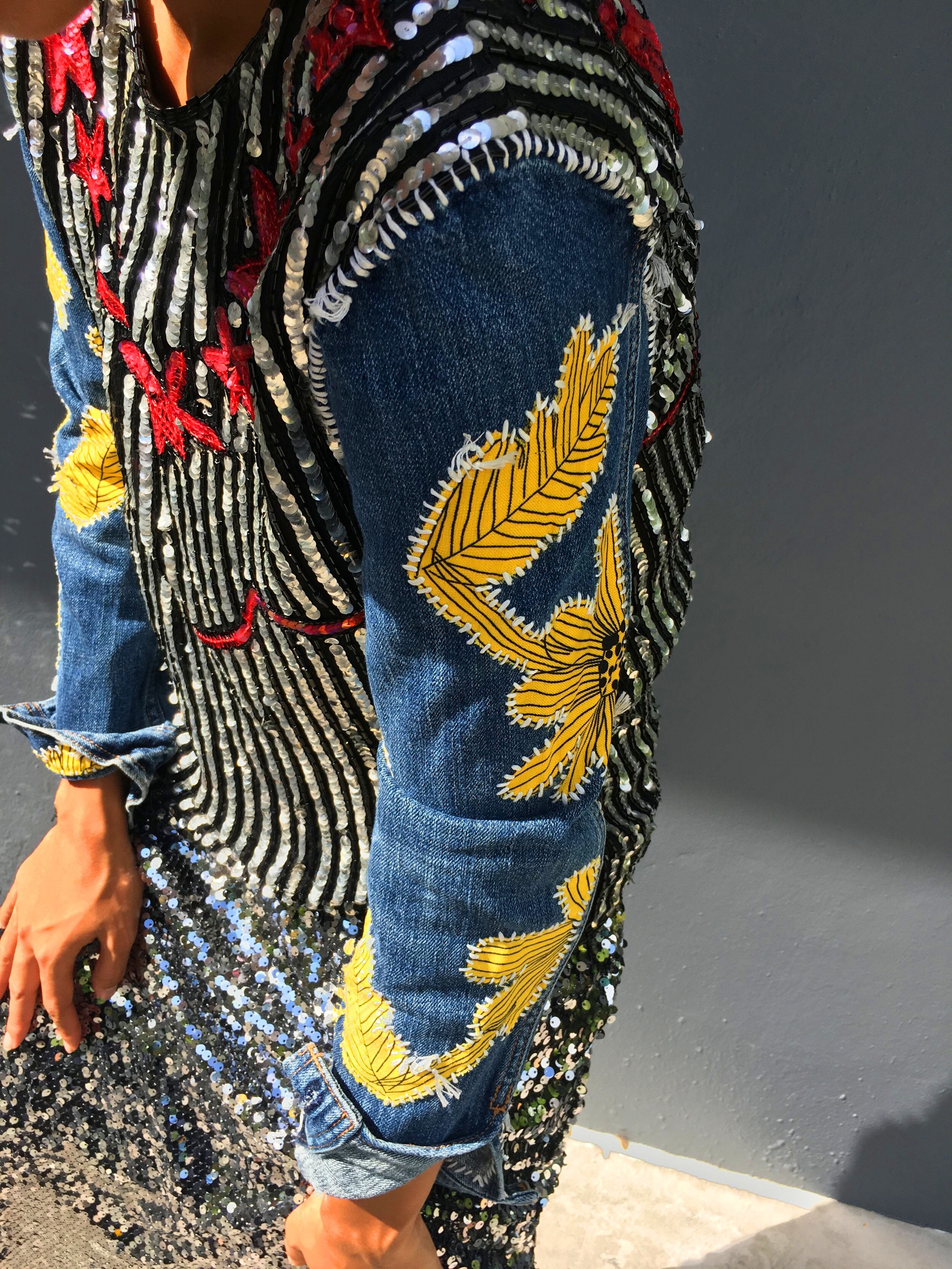 To design this beautiful vintage black silver and red sequin top I replaced the sleeves with repurposed denim ones cut from a jacket and placed yellow flowers cut from a playsuit. The white embroidery thread lets every element shine.