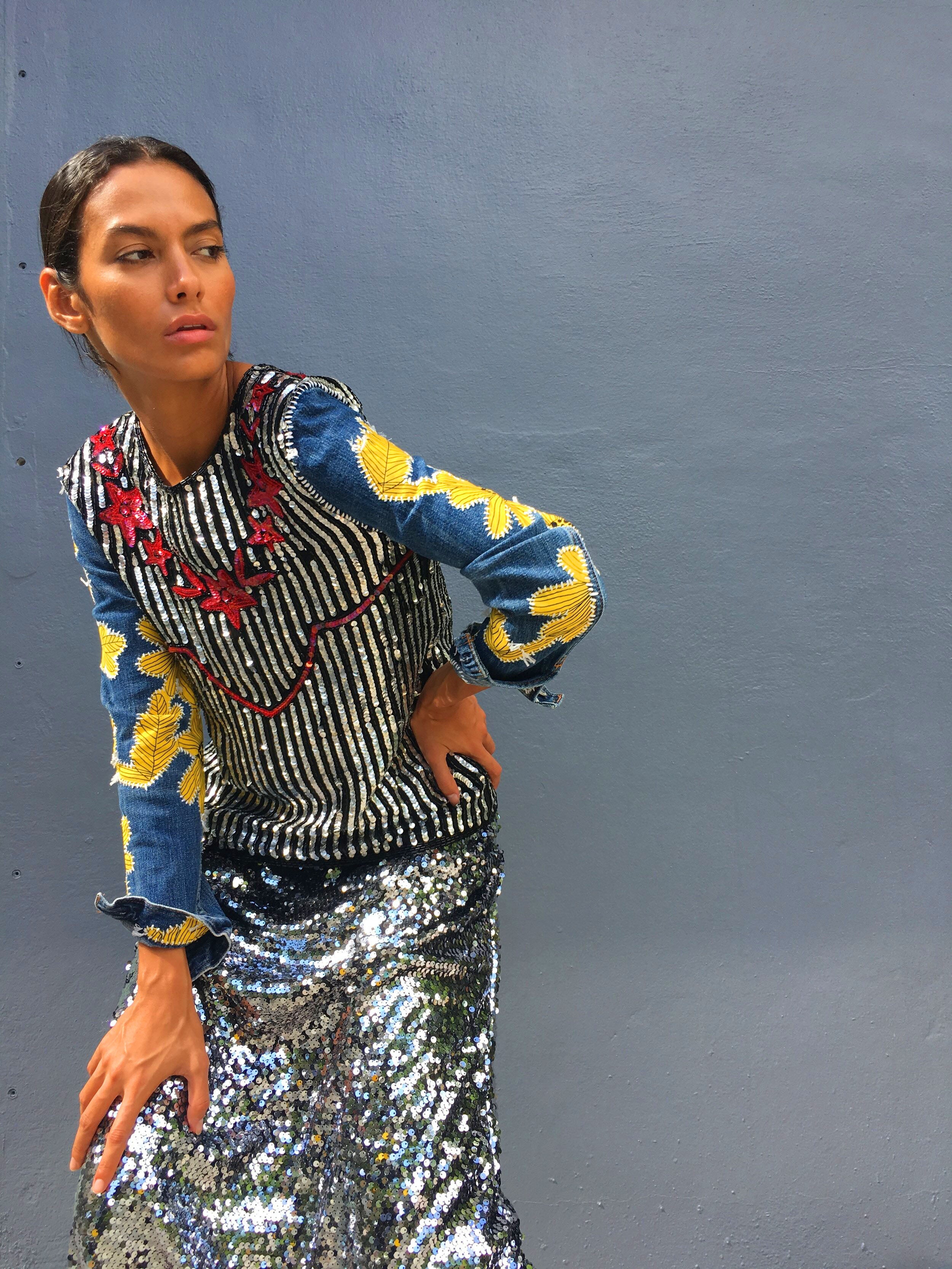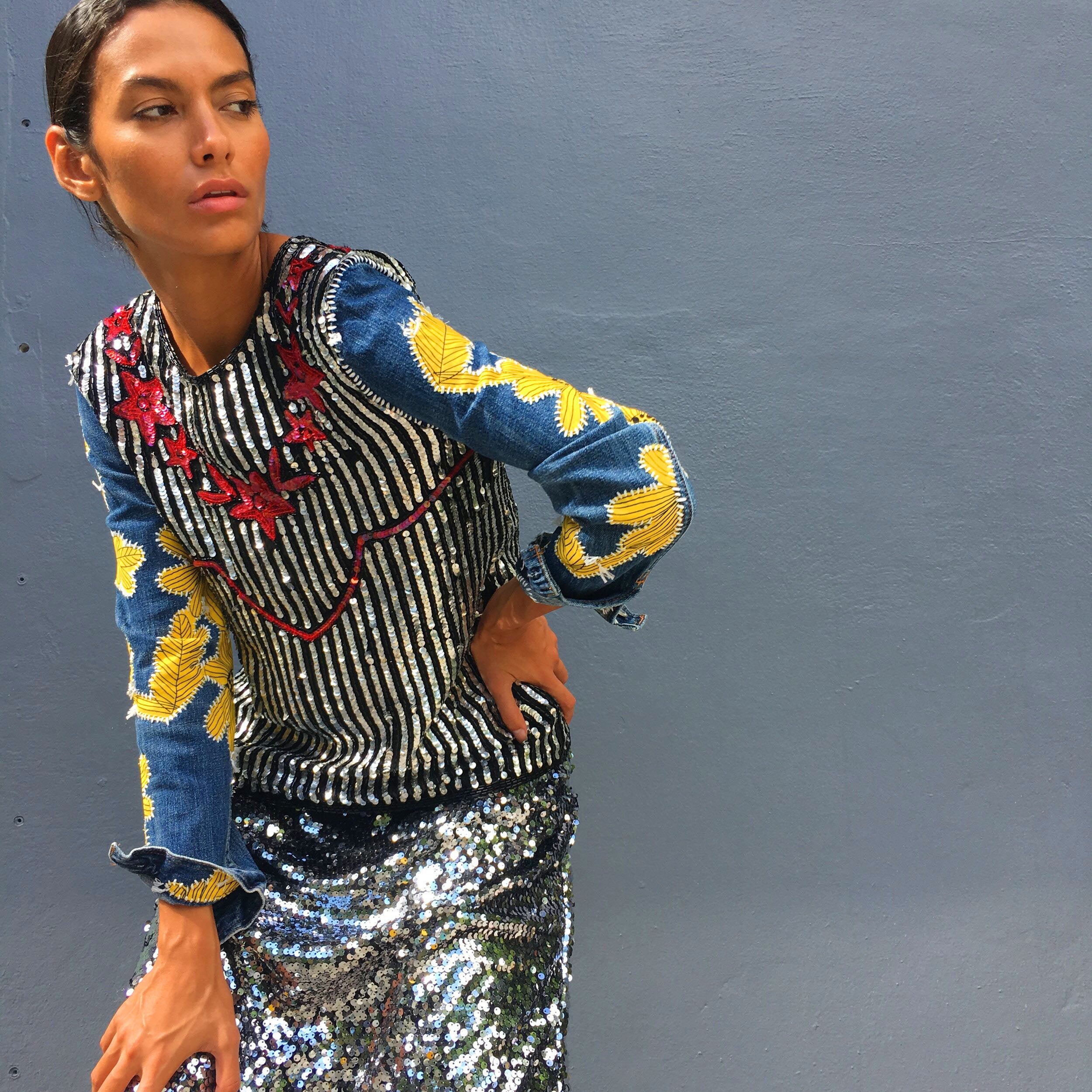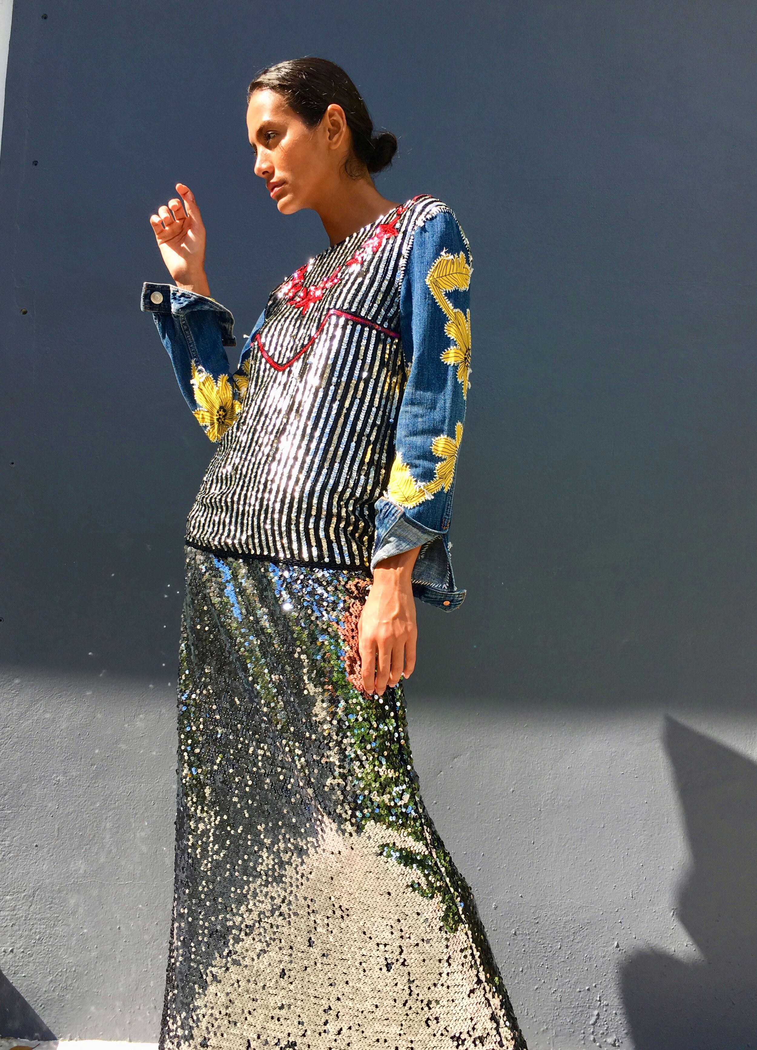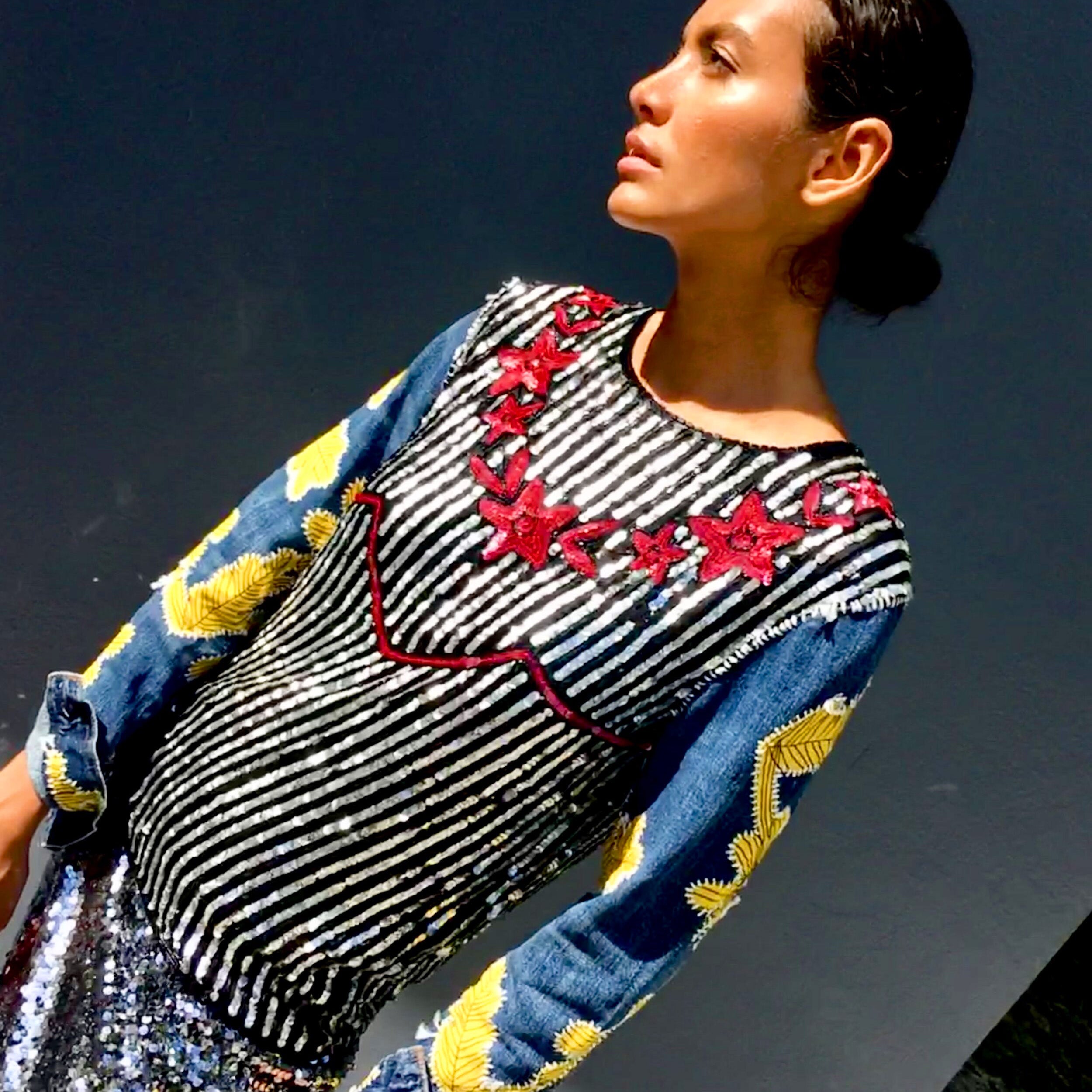 To design this beautiful vintage black silver and red sequin top I replaced the sleeves with repurposed denim ones cut from a jacket and placed yellow flowers cut from a playsuit. The white embroidery thread lets every element shine.