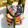 To design this pre-owned camo backpack, I used birds reclaimed from a dress, stripes from a pant and circles from a Vintage Chinese jacket. I imagined all those colors together with the cobalt blue embroidery thread as a beautiful combination. I replaced the hardware, and original straps for wider more comfortable green leather ones.